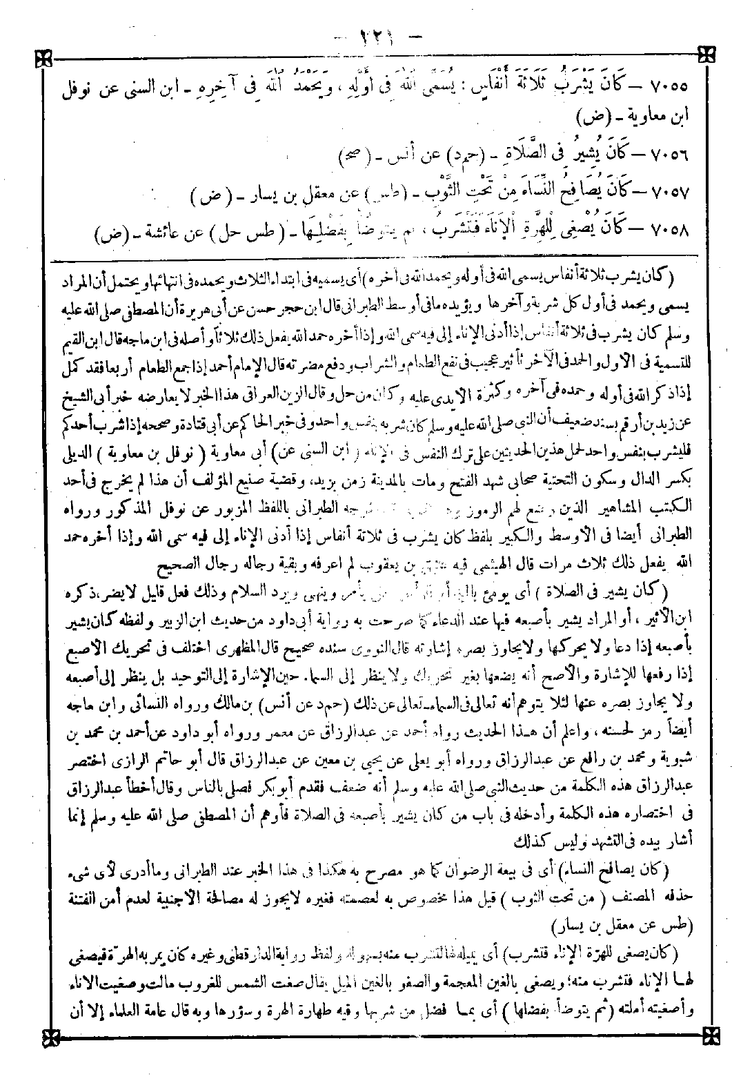 -[221]- 7055 - (كان يشرب ثلاثة أنفاس يسمي الله في أوله ويحمد الله في آخره) أي يسميه في ابتداء الثلاث ويحمده في انتهائها ويحتمل أن المراد يسمي في أول كل شربة وآخرها ويؤيده في أوسط الطبراني قال ابن حجر: حسن عن أبي هريرة أن المصطفى صلى الله عليه وسلم كان يشرب في ثلاثة أنفاس إذا أدنى الإناء إلى فيه سمى الله وإذا أخره حمد الله يفعل ذلك ثلاثا وأصله في ابن ماجه قال ابن القيم: للتسمية في الأول والحمد في الآخر تأثير عجيب في نفع الطعام والشراب ودفع مضرته قال الإمام أحمد: إذا جمع الطعام أربعا فقد كمل إذا ذكر الله في أوله وحمده في آخره وكثرة الأيدي عليه وكان من حل وقال الزين العراقي: هذا الخبر لا يعارضه خبر أبي الشيخ عن زيد بن الأرقم بسند ضعيف أن النبي صلى الله عليه وسلم كان شربه بنفس واحد في خبر الحاكم عن أبي قتادة وصححه إذا شرب أحدكم فليشرب بنفس واحد لحمل هذين الحدثين على ترك النفس في الإناء