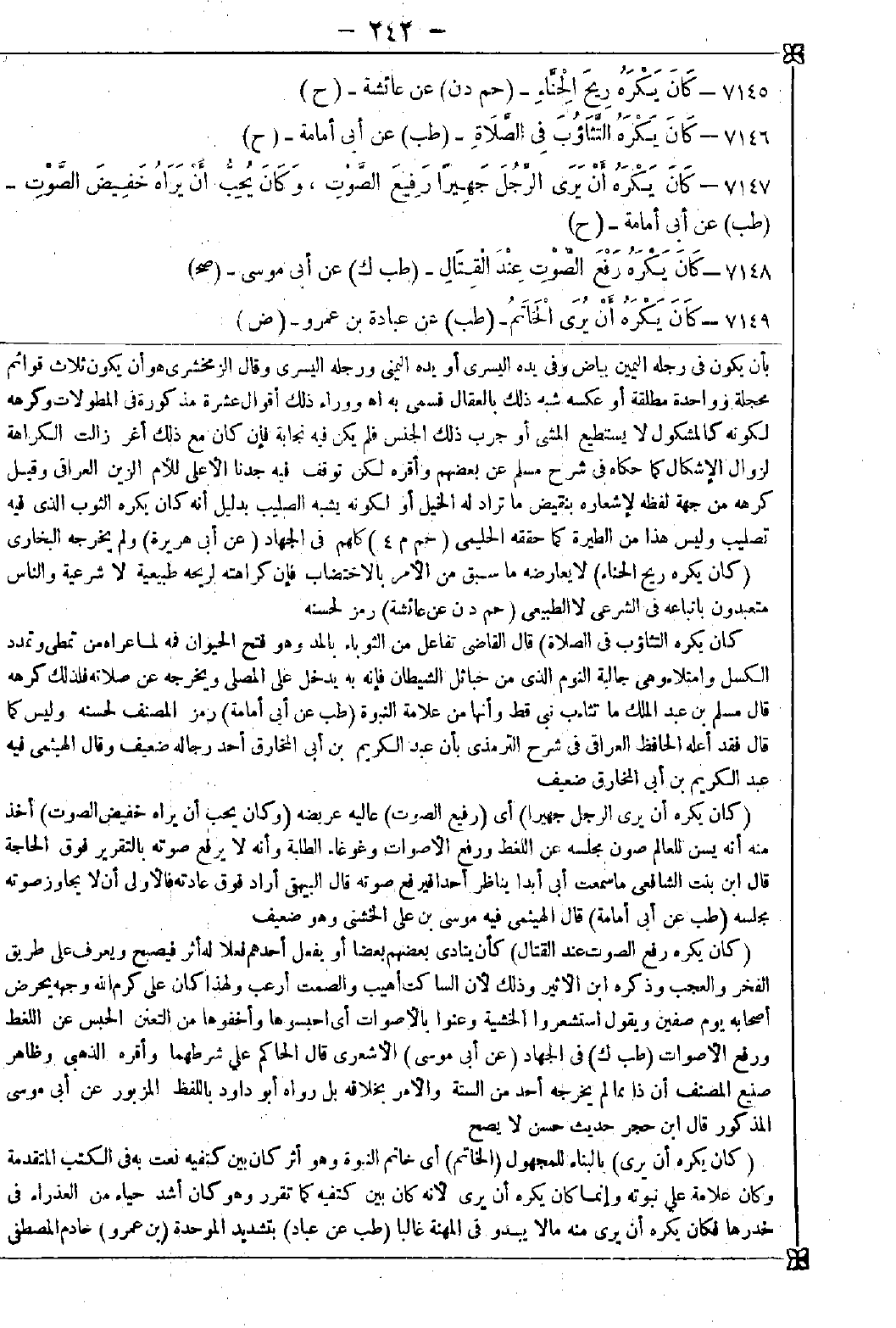 7145 - (كان يكره ريح الحناء) لا يعارضه ما سبق من الأمر بالاختضاب فإن كراهته لريحه طبيعية لا شرعية والناس متعبدون باتباعه في الشرعي لا الطبيعي