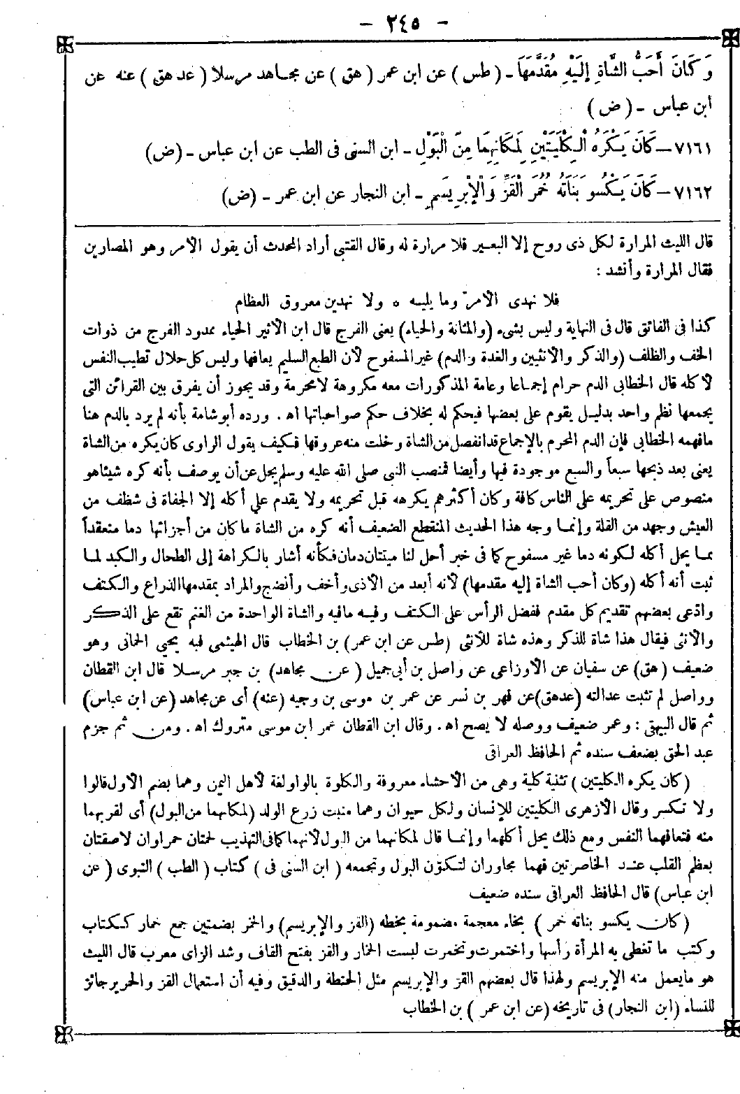 7161 - (كان يكره الكليتين) تثنية كلية وهي من الأحشاء معروفة والكلوة بالواو لغة لأهل اليمن وهما بضم الأول قالوا ولا تكسر وقال الأزهري: الكليتين للإنسان ولكل حيوان وهما منبت زرع الولد (لمكانهما من البول) أي لقربهما منه فتعافهما النفس ومع ذلك يحل أكلهما وإنما قال لمكانهما من البول لأنهما كما في التهذيب لحمتان حمراوان لاصقتان بعظم القلب عند الخاصرتين فهما مجاوران لتكون البول وتجمعه