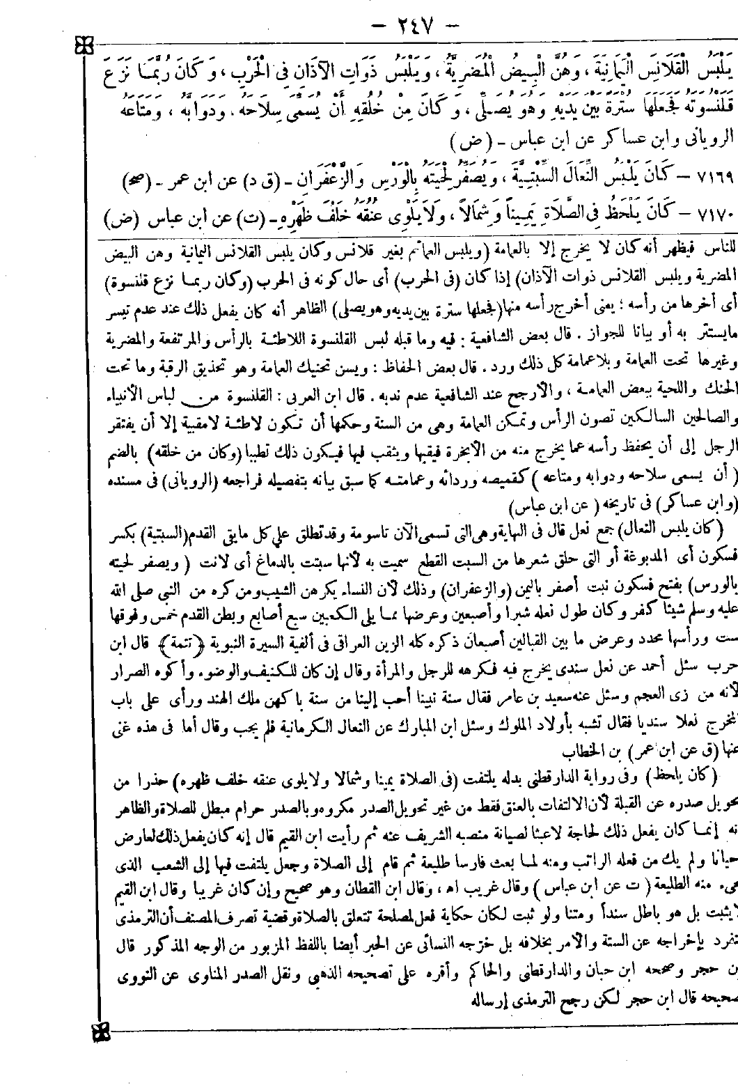 7169 - (كان يلبس النعال) جمع نعل قال في النهاية: وهي التي تسعى الآن تاسومة وقد تطلق على كل ما يقي القدم (السبتية) بكسر فسكون أي المدبوغة أو التي حلق شعرها من السبت القطع سميت به لأنها سبتت بالدماغ أي لانت (ويصفر لحيته بالورس) بفتح فسكون نبت أصفر باليمين (والزعفران) وذلك لأن النساء يكرهن الشيب ومن كره من النبي صلى الله عليه وسلم شيئا كفر وكان طول نعله شبرا وأصبعين وعرضها مما يلي الكعبين سبع أصابع وبطن القدم خمس وفوقها ست ورأسها محدد وعرض ما بين القبالين أصبعان ذكره كله الزين العراقي في ألفية السيرة النبوية