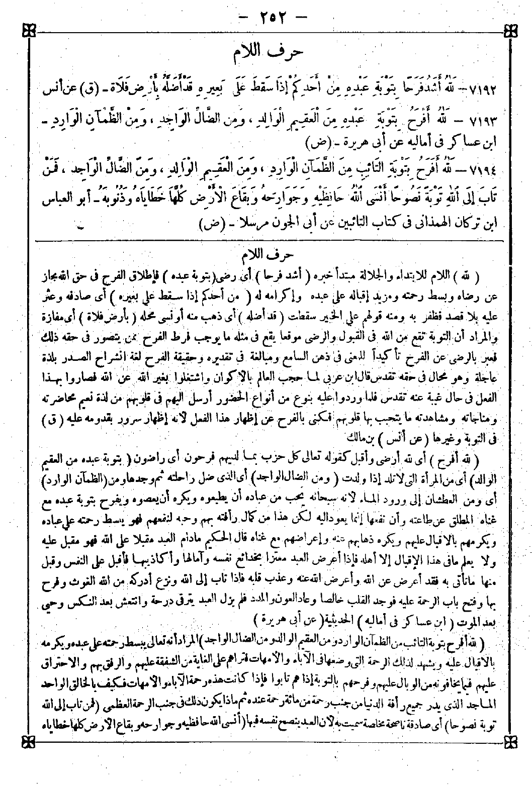 7194 - (لله أفرح بتوبة التائب من الظمآن الوارد ومن العقيم الوالد ومن الضال الواجد) المراد أنه تعالى يبسط رحمته على عبده ويكرمه بالإقبال عليه ويشهد لذلك الرحمة التي وضعها في الآباء والأمهات فتراهم على الغاية من الشفقة عليهم والرفق بهم والاحتراق عليهم فيما يخافونه من الوبال عليهم وفرحهم بالتوبة إذا هم تابوا فإذا كانت هذه رحمة الآباء والأمهات فكيف بالخالق الواحد الماجد الذي يدر جميع رأفة الدنيا من جنب رحمة من مئة رحمة عنده ثم ماذا يكون ذلك في جنب الرحمة العظمى (فمن تاب إلى الله توبة نصوحا) أي صادقة ناصحة مخلصة سميت به لأن العبد ينصح نفسه فيها (أنسى الله حافظيه وجوارحه وبقاع الأرض كلها خطاياه -[253]- جمع خطيئة وهي الذنب ولغرض التأكيد ومزيد النعميم جمع بينها وبين قوله (وذنوبه) فإن الله يحب التوابين والحبيب يستر الحبيب فإن بدا زين نشره أو شين ستره فإذا أحب عبدا فأذنب ستره حتى عن أبعاضه والذنب يدنس العبد والرجوع إلى الله يطهره وللعبد صفتان معصية وطاعة فالراجع عن المعصية تواب والمكثر من الطاعة أواب ويسمى حبيب الله