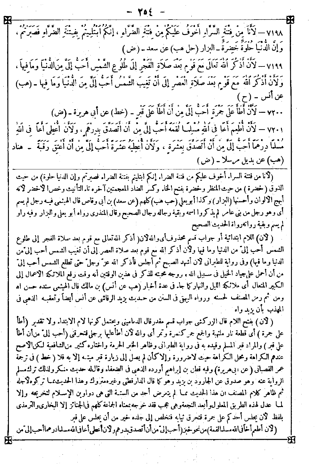 7199 - (لأن) اللام ابتدائية أو جواب قسم محذوف أي والله لأن (أذكر الله تعالى مع قوم بعد صلاة الفجر إلى طلوع الشمس أحب إلي من الدنيا وما فيها ولأن أذكر الله مع قوم بعد صلاة العصر إلى أن تغيب الشمس أحب إلي من الدنيا وما فيها) وفي رواية للطبراني لأن أشهد الصبح ثم أجلس فأذكر الله عز وجل حتى تطلع الشمس أحب إلي من أن أحمل على جياد الخيل في سبيل الله ووجه محبته للذكر في هذين الوقتين أنه وقت رفع الملائكة الأعمال إلى الكبير المتعال أي ملائكة الليل والنهار كما جاء في عدة أخبار