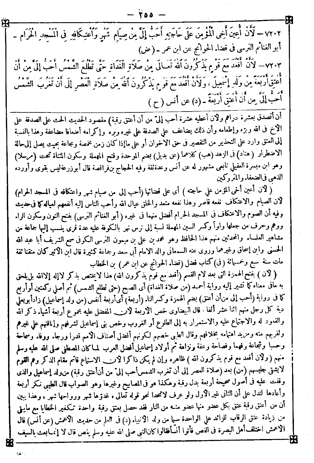 7203 - (لأن) بفتح الهمزة التي بعد لام القسم (أقعد مع قوم يذكرون الله) هذا لا يختص بذكر لا إله إلا الله بل يلحق به ما في معناه كما تشير إليه رواية أحمد (من صلاة الغداة) أي الصبح (حتى تطلع الشمس) ثم أصلي ركعتين أو أربع كما في رواية (أحب إلي من أن أعتق) بضم الهمزة وكسر التاء (أربعة) أي أربعة أنفس (من ولد إسماعيل) زاد أبو يعلى دية كل رجل منهم اثنا عشر ألفا. قال البيضاوي: خص الأربعة لأن المفضل عليه مجموع أربعة أشياء ذكر الله والقعود له والاجتماع عليه والاستمرار به إلى الطلوع أو الغروب وخص بني إسماعيل لشرفهم وإنافتهم على غيرهم ولقربهم منه ومزيد اهتمامه بخلافهم وقال الطيبي: خصهم لكونهم أفضل أصناف الأمم قدرا ورجاء ووفاء وسماحة وحسبا وشجاعة وفهما وفصاحة وعفة ونزاهة ثم أولاد إسماعيل أفضل العرب لما كان المصطفى صلى الله عليه وسلم منهم (ولأن أقعد مع قوم يذكرون الله) ظاهره وإن لم يكن ذاكرا لأن الاستماع قائم مقام الذكر وهم القوم لا يشقى جليسهم (من) بعد (صلاة العصر إلى أن تغرب الشمس أحب إلي من أن أعتق رقبة) من ولد إسماعيل والذي وقفت عليه في أصول صحيحة أربعة بدل رقبة وهكذا هو في المصابيح وغيرها وهو الصواب قال الطيبي: نكر أربعة وأعادها لتدل على أن الثاني غير الأول ولو عرف لاتحدا نحو قوله تعالى {غدوها شهر ورواحها شهر} وهذا يبين أن من أعتق رقبة عتق بكل عضو منها عضو منه من النار فقد حصل بعتق رقبة واحدة تكفير الخطايا مع ما يبقى من زيادة عتق الرقاب للزائد على الواحدة سيما من ولد الأنبياء
