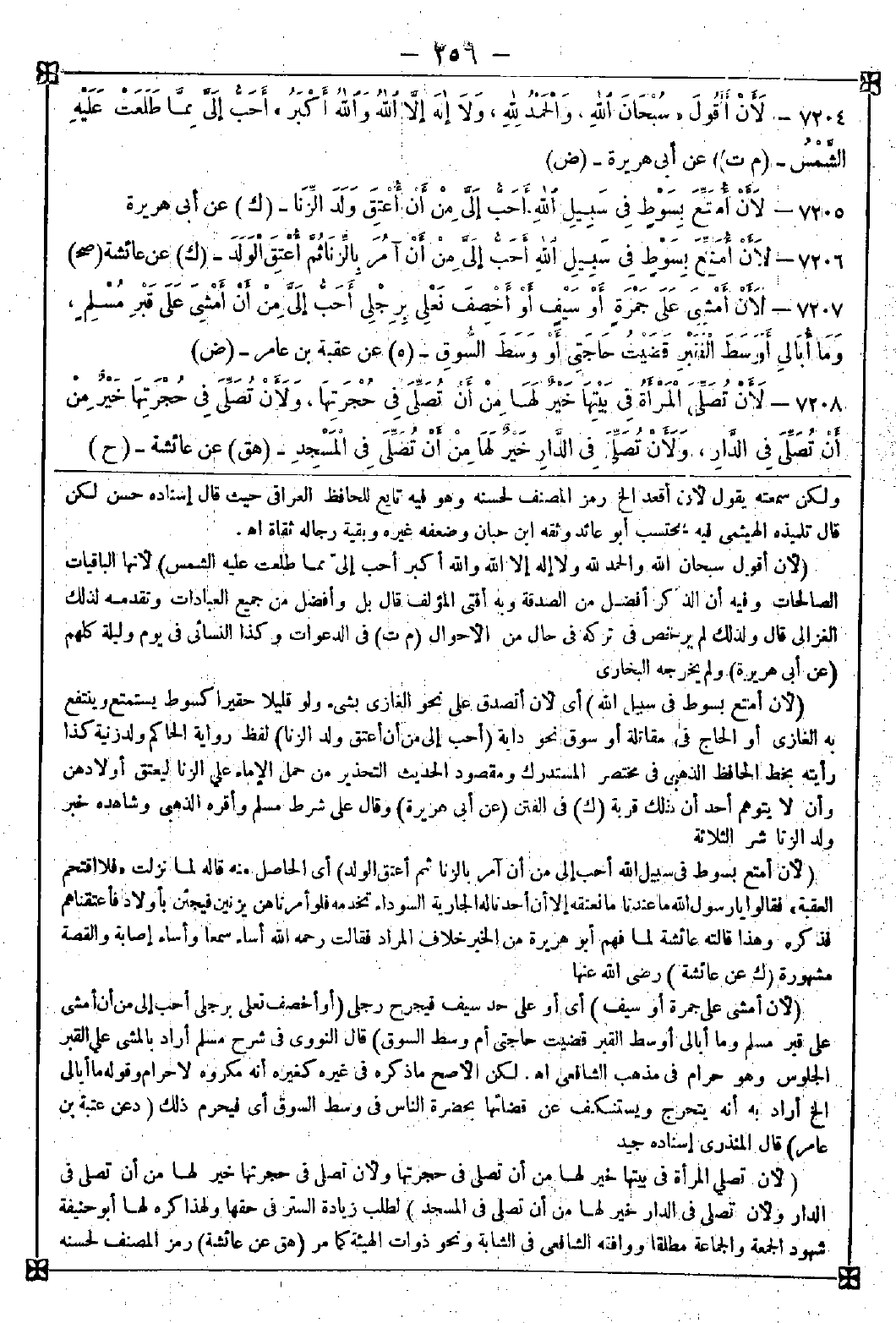 7208 - (لأن تصلي المرأة في بيتها خير لها من أن تصلي في حجرتها ولأن تصلي في حجرتها خير لها من أن تصلي في الدار ولأن تصلي في الدار خير لها من أن تصلي في المسجد) لطلب زيادة الستر في حقها ولهذا كره لها أبو حنيفة شهود الجمعة والجماعة مطلقا ووافقه الشافعي في الشابة ونحو ذوات الهيئة كما مر