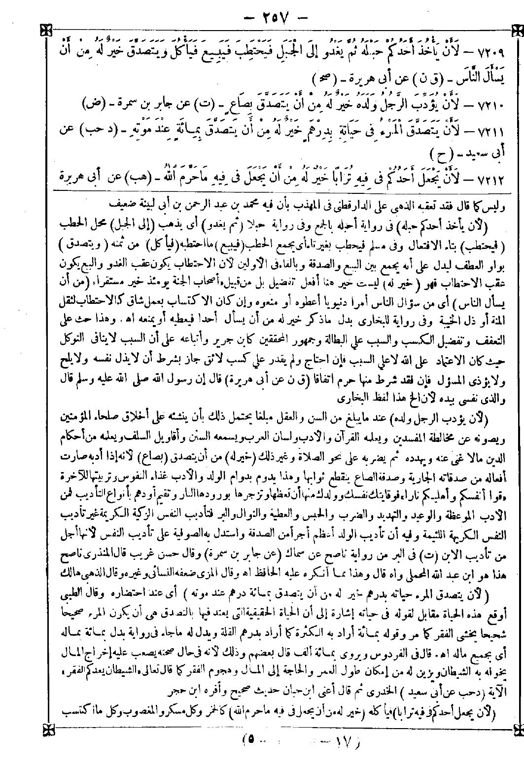 7209 - (لأن يأخذ أحدكم حبله) في رواية أحبله بالجمع وفي رواية حبلا (ثم يغدو) أي يذهب (إلى الجبل) محل الحطب (فيحتطب) بتاء الافتعال وفي مسلم فيحطب بغير تاء أي يجمع الحطب (فيبيع) ما احتطبه (فيأكل) من ثمنه (ويتصدق) بواو العطف ليدل على أنه يجمع بين البيع والصدقة وبالفاء في الأولين لأن الاحتطاب يكون عقب الغدو والبيع يكون عقب الاحتطاب فهو (خير له) ليست خير هنا أفعل تفضيل بل من قبيل {أصحاب الجنة يومئذ خير مستقرا} (من أن يسأل الناس) أي من سؤال الناس أمرا دنيويا أعطوه أو منعوه وإن كان الاكتساب بعمل شاق كالاحتطاب لثقل المنة أو ذل الخيبة وفي رواية للبخاري بدل ما ذكر خير له من أن يسأل أحدا فيعطيه أو يمنعه اه. وهذا حث على التعفف وتفضيل الكسب والسبب على البطالة وجمهور المحققين كابن جرير وأتباعه على أن السبب لا ينافي التوكل حيث كان الاعتماد على الله لا على السبب فإن احتاج ولم يقدر على كسب لائق جاز بشرط أن لا يذل نفسه ولا يلح ولا يؤذي المسؤول فإن فقد شرط منها حرم اتفاقا