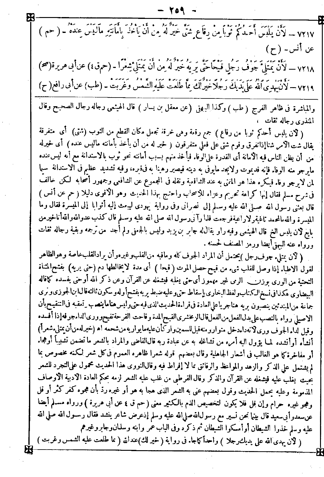 7218 - (لأن يمتلئ جوف رجل) يحتمل أن المراد الجوف كله وما فيه من القلب وغيره وأن يراد القلب خاصة وهو الظاهر لقول الأطباء إذا وصل للقلب شيء من قيح حصل الموت (قيحا) أي مدة لا يخالطها دم (حتى يريه) بفتح المثناة التحتية من الورى بوزن الرمى غير مهموز أي حتى يغلبه فيشغله عن القرآن وعن ذكر الله أو حتى يفسده كما قاله البيضاوي هكذا في نسخ الكتاب ولفظ البخاري بإسقاط حتى وعليه ضبط يريه بفتح أوله وسكون ثالثه قال ابن الجوزي: ونرى جماعة من المبتدئين ينصبون يريه هنا جريا على العادة في قراءة الحديث الذي فيه حتى وليس هنا ما ينصب وتعقبه في التنقيح بأن الأصيلي رواه بالنصب على بدل الفعل من الفعل قال الزمخشري: القيح المدة وقاحت القرحة تقيح وورى الداء جوفه إذا أفسده وقيل لداء الجوف ورى لأنه داء دخل متوار ومنه قيل للسمين وار كأن عليه ما يواريه من شحمه اه. (خير له من أن يمتلئ شعرا) أنشأه أو أنشده لما يؤول إليه أمره من تشاغله به عن عبادة ربه قال القاضي: والمراد بالشعر ما تضمن تشبيبا أو هجاء أو مفاخرة كما هو الغالب في أشعار الجاهلية وقال بعضهم: قوله شعرا ظاهره العموم في كل شعر لكنه مخصوص بما لم يشتمل على الذكر والزهد والمواعظ والرقائق مما لا إفراط فيه وقال النووي: هذا الحديث محمول على التجرد للشعر بحيث يغلب عليه فيشغله عن القرآن والذكر وقال القرطبي: من غلب عليه الشعر لزمه بحكم العادة الأدبية الأوصاف المذمومة وعليه يحمل الحديث وقول بعضهم عنى به الشعر الذي هجا به هو أو غيره رد بأن هجوه كفر كثر أو قل وهجو غيره حرام وإن قل فلا يكون لتخصيص الذم بالكثير معنى