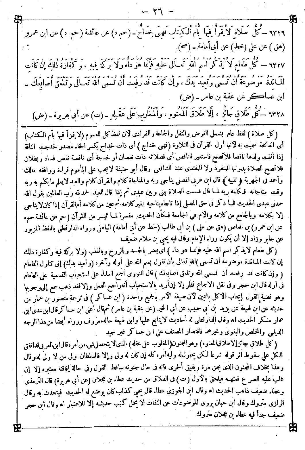 -[26]- 6326 - (كل صلاة) لفظ عام يشمل الفرض والنفل والجماعة والفرادى لأن لفظ كل للعموم (لا يقرأ فيها بأم الكتاب) أي الفاتحة سميت به لأنها أول القرآن في التلاوة (فهي خداج) أي ذات خداج بكسر الخاء مصدر خدجت الناقة إذا ألقت ولدها ناقصا فلا تصح فاستعير للناقص أي فصلاته ذات نقصان أو خدجة أي ناقصة نقص فساد وبطلان فلا تصح الصلاة بدونها للمنفرد ولا للمقتدي عند الشافعي وقال أبو حنيفة: لا يجب على المأموم قراءة ووافقه مالك وأحمد في الجهرية