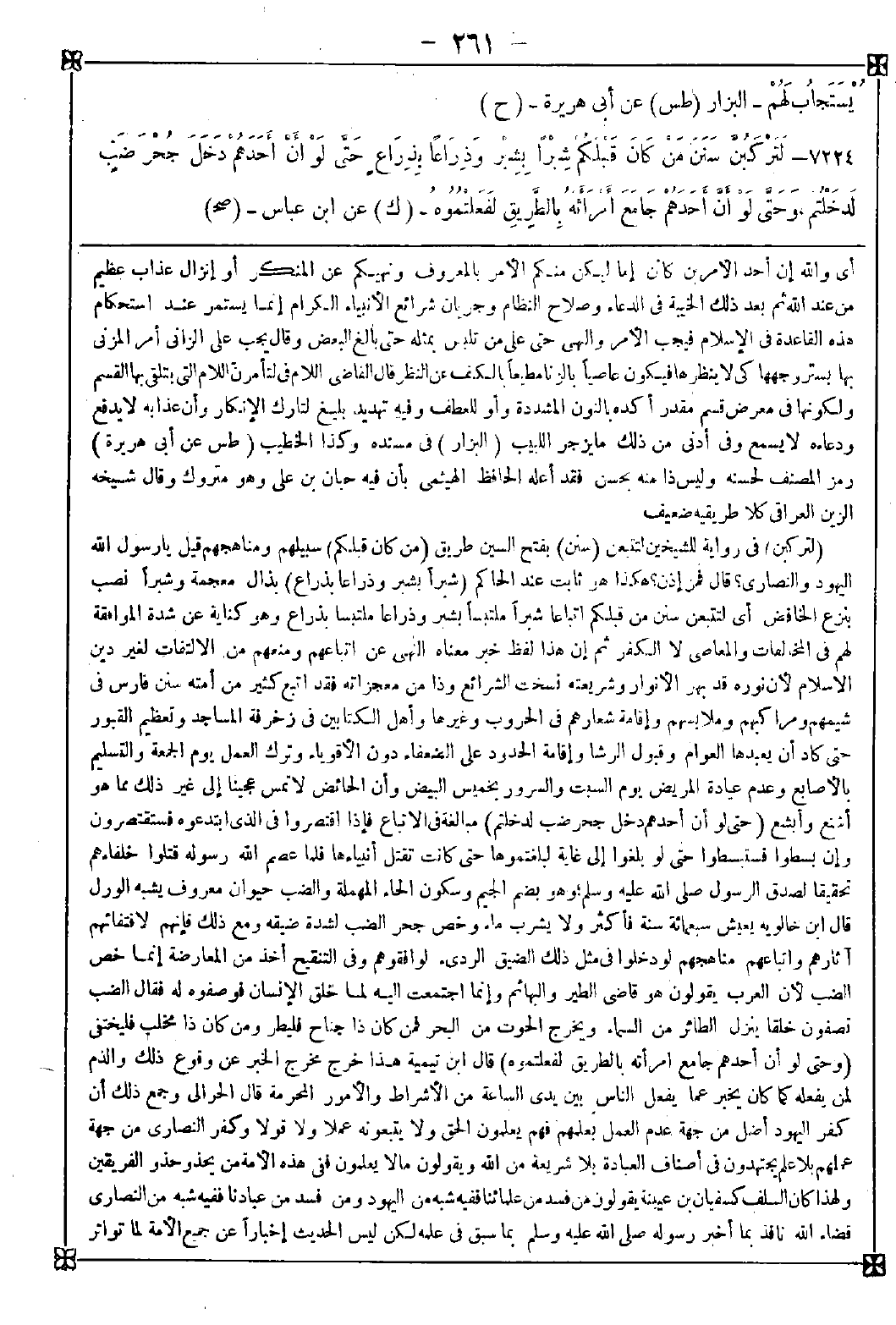 7224 - (لتركبن) في رواية للشيخين لتتبعن (سنن) بفتح السين طريق (من كان قبلكم) سبيلهم ومناهجهم قيل: يا رسول الله اليهود والنصارى؟ قال: فمن إذن؟ هكذا هو ثابت عند الحاكم (شبرا بشبر وذراعا بذراع) بذال معجمة وشبرا نصب بنزع الخافض أي لتتبعن سنن من قبلكم اتباعا شبرا متلبسا بشبر وذراعا متلبسا بذراع وهو كناية عن شدة الموافقة لهم في المخالفات والمعاصي لا الكفر ثم إن هذا لفظ خبر معناه النهي عن اتباعهم ومنعهم من الالتفات لغير دين الإسلام لأن نوره قد بهر الأنوار وشرعته نسخت الشرائع وذا من معجزاته فقد اتبع كثير من أمته سنن فارس في شيمهم ومراكبهم وملابسهم وإقامة شعارهم في الحروب وغيرها وأهل الكتابين في زخرفة المساجد وتعظيم القبور حتى كاد أن يعبدها العوام وقبول الرشا وإقامة الحدود على الضعفاء دون الأقوياء وترك العمل يوم الجمعة والتسليم بالأصابع وعدم عيادة المريض يوم السبت والسرور بخميس البيض وأن الحائض لا تمس عجينا إلى غير ذلك مما هو أشنع وأبشع (حتى لو أن أحدهم دخل جحر ضب لدخلتم) ممبالغة في الإتباع فإذا اقتصروا في الذي ابتدعوه فستقتصرون وإن بسطوا فستبسطوا حتى لو بلغوا إلى غاية لبلغتموها حتى كانت تقتل أنبياءها فلما عصم الله رسوله قتلوا خلفاءهم تحقيقا لصدق الرسول صلى الله عليه وسلم وهو بضم الجيم وسكون الحاء المهملة والضب حيوان معروف يشبه الورل قال ابن خالويه: يعيش سبع مئة سنة فأكثر ولا يشرب ماء وخص جحر الضب لشدة ضيقه ومع ذلك فإنهم لاقتفائهم آثارهم واتباعهم مناهجهم لو دخلوا في مثل ذلك الضيق الرديء لوافقوهم وفي التنقيح أخذ من المعارضة إنما خص الضب لأن العرب يقولون هو قاضي الطير والبهائم وإنما اجتمعت إليه لما خلق الإنسان فوصفوه له فقال الضب تصفون خلقا ينزل الطائر من السماء ويخرج الحوت من البحر فمن كان ذا جناح فليطر ومن كان ذا مخلب فليختفي (وحتى لو أن أحدهم جامع امرأته بالطريق لفعلتموه) قال ابن تيمية: هذا خرج مخرج الخبر عن وقوع ذلك والذم لمن يفعله كما كان يخبر عما يفعل الناس بين يدي الساعة من الأشراط والأمور المحرمة قال الحرالي: وجمع ذلك أن كفر اليهود أضل من جهة عدم العمل بعلمهم فهم يعملون الحق ولا يتبعونه عملا ولا قولا وكفر النصارى من جهة عملهم بلا علم يجتهدون في أصناف العبادة بلا شريعة من الله ويقولون ما لا يعلمون ففي هذه الأمة من يحذو حذو الفريقين ولهذا كان السلف كسفيان بن عيبنة يقولون من فسد من علمائنا ففيه شبه من اليهود ومن فسد من عبادنا ففيه شبه من النصارى قضاء الله نافذ بما أخبر رسوله صلى الله عليه وسلم بما سبق في علمه لكن ليس الحديث إخبارا عن جميع الأمة لما تواتر -[262]- عنه أنها لا تجتمع على ضلالة ثم إنه فسر هنا باليهود والنصارى وفي خبر البخاري بفارس والروم ولا تعارض لاختلاف الجواب بحسب اختلاف المقام فحيث قيل فارس والروم كان ثم قرينة تتعلق بالحكم بين الناس وسياسة الرعية وحيث قيل اليهود والنصارى كان هناك قرينة تتعلق بأمر الديانات أصولها وفروعها