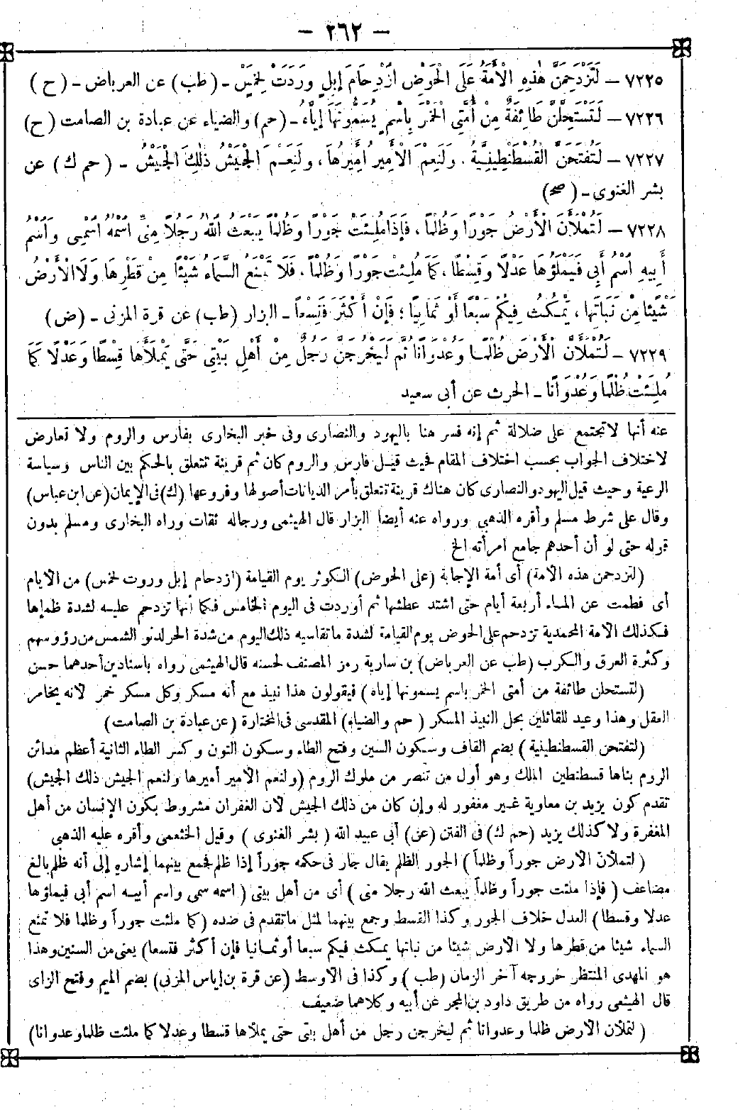 7229 - (لتملأن الأرض ظلما وعدوانا ثم ليخرجن رجل من أهل بيتي حتى يملأها قسطا وعدلا كما ملئت ظلما وعدوانا) -[263]- العدوان هو الظلم يقال عدا عليه يعدو عدوانا وظلما أي ظلم وتجاوز الحد فجمع لمثل ما تقدم في ضده
