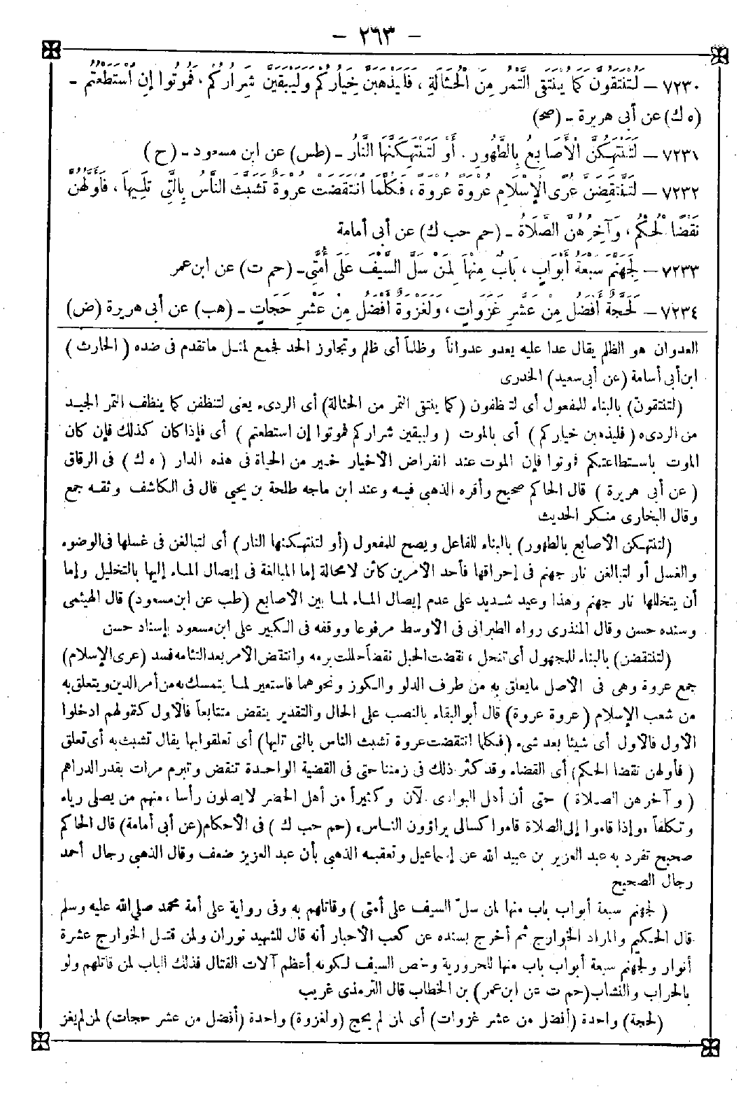 7232 - (لتنقضن) بالبناء للمجهول أي تنحل نقضت الحبل نقضا حللت برمه وانتقض الأمر بعد التئامه فسد (عرى الإسلام) جمع عروة وهي في الأصل ما يعلق به من طرف الدلو والكوز ونحوهما فاستعير لما يتمسك به من أمر الدين ويتعلق به من شعب الإسلام (عروة عروة) قال أبو البقاء: بالنصب على الحال والتقدير ينقض متتابعا فالأول كقولهم ادخلوا الأول فالأول أي شيئا بعد شيء (فكلما انتقضت عروة تشبث الناس بالتي تليها) أي تعلقوا بها يقال تشبث به أي تعلق (فأولهن نقضا الحكم) أي القضاء وقد كثر ذلك في زمننا حتى في القضية الواحدة تنقض وتبرم مرات بقدر الدراهم (وآخرهن الصلاة) حتى أن أهل البوادي الآن وكثيرا من أهل الحضر لا يصلون رأسا ومنهم من يصلي رياء وتكلفا {وإذا قاموا إلى الصلاة قاموا كسالى يراؤون الناس}