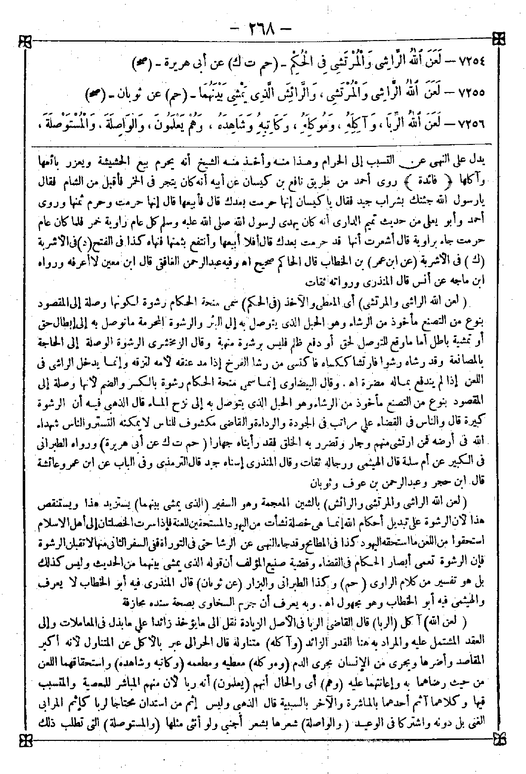 7254 - (لعن الله الراشي والمرتشي) أي المعطي والآخذ (في الحكم) سمي منحة الحكام رشوة لكونها وصلة إلى المقصود بنوع من التصنع مأخوذ من الرشاء وهو الحبل الذي يتوصل به إلى البئر والرشوة المحرمة ما توصل به إلى إبطال حق أو تمشية باطل أما ما وقع للتوصل لحق أو دفع ظلم فليس برشوة منهية وقال الزمخشري: الرشوة الوصلة إلى الحاجة بالمصانعة وقد رشاه رشوا فارتشا ككساه فاكتسى من رشا الفرخ إذا مد عنقه لأمه لتزقه وإنما يدخل الراشي في اللعن إذا لم يندفع بماله مضرة اه. وقال البيضاوي: إنما سمى منحة الحكام رشوة بالكسر والضم لأنها وصلة إلى المقصود بنوع من التصنع مأخوذ من الرشاء وهو الحبل الذي يتوصل به إلى نزح الماء قال الذهبي: فيه أن الرشوة كبيرة قال: والناس في القضاء على مراتب في الجودة والرداءة والقاضي مكشوف للناس لا يمكنه التستر والناس شهداء الله في أرضه فمن ارتشى منهم وجار وتضرر به الخلق فقد رأيناه جهارا