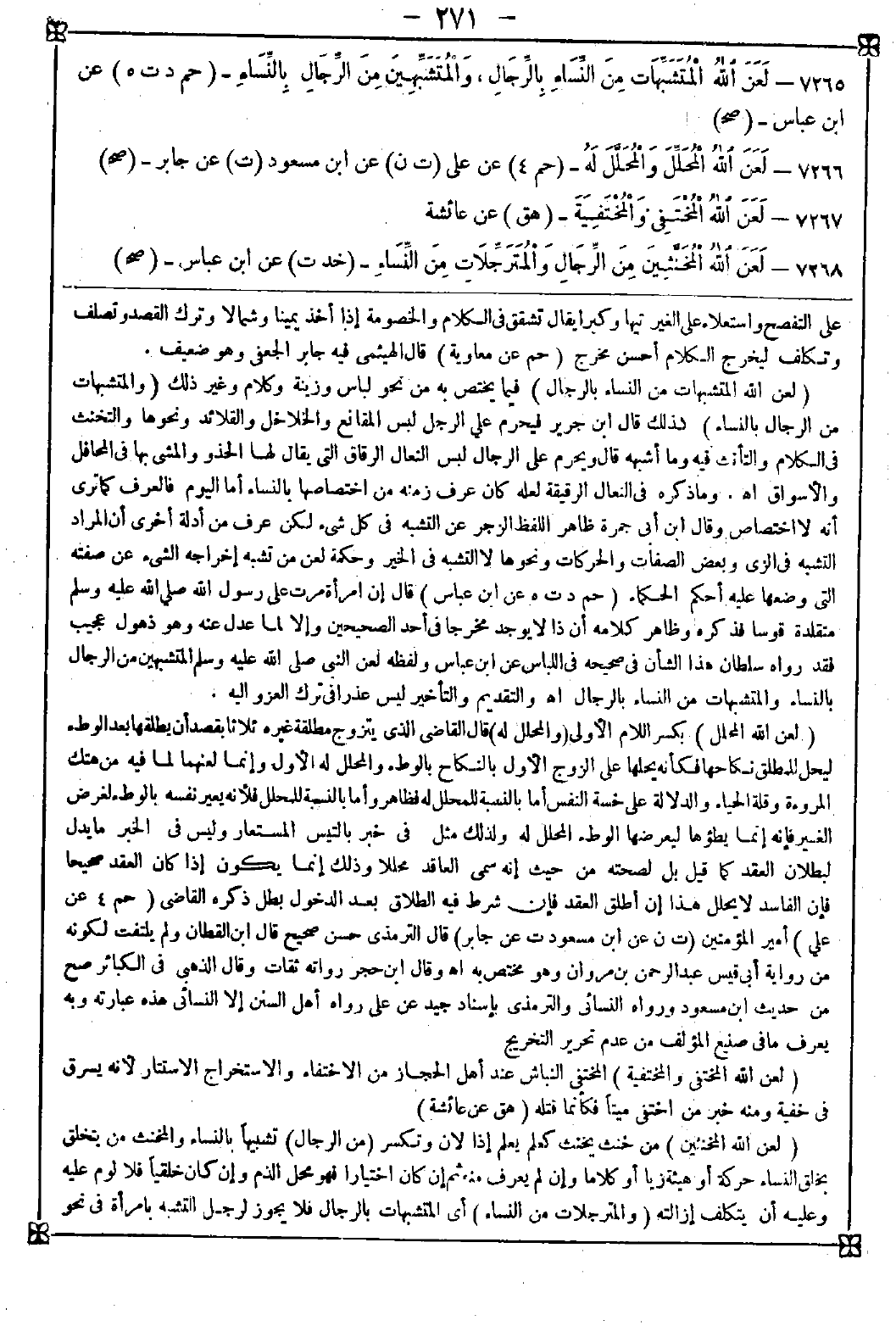 7268 - (لعن الله المخنثين) من خنث يخنث كعلم يعلم إذا لان وتكسر (من الرجال) تشبيها بالنساء والمخنث من يتخلق بخلق النساء حركة أو هيئة زيا أو كلاما وإن لم يعرف منه ثم إن كان اختيارا فهو محل الذم وإن كان خلقيا فلا لوم عليه وعليه أن يتكلف إزالته (والمترجلات من النساء) أي المتشبهات بالرجال فلا يجوز لرجل التشبه بإمرأة في نحو -[272]- لباس أو هيئة ولا لرجل التشبه بها في ذلك خلافا للأسنوي من الشافعية لما فيه من تغيير خلق الله وإذا كان المتشبه (من الرجال بالنساء) ملعونا فما بالك فيمن تشبه منهم بهن في الفعل به فهو ملعون من جهة تخنثه في نحو كلامه وحركاته ومن جهة الفاحشة العظمى قال ابن تيمية: والمخنث قد يكون قصده عشرة النساء ومباشرته لهن وقد يكون قصده مباشرة الرجال له وقد يجمع الأمرين وقال الطيبي: وقوله من النساء بيان للرجلة لأن التاء فيها لإرادة الوصفية