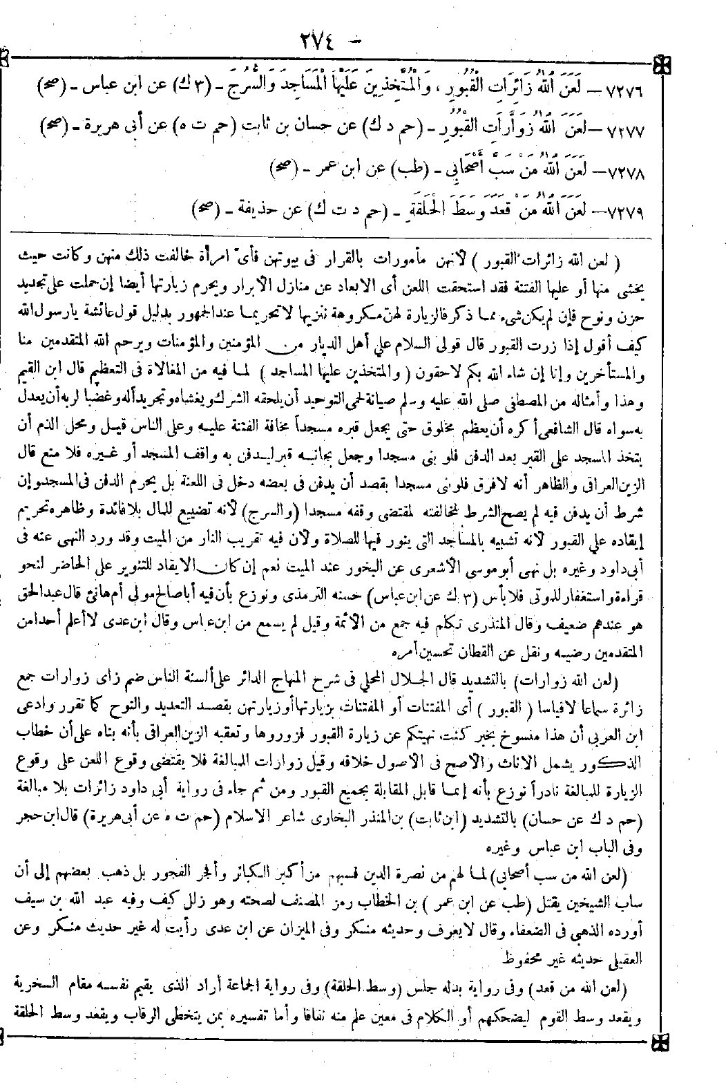 -[274]- 7276 - (لعن الله زائرات القبور) لأنهن مأمورات بالقرار في بيوتهن فأي امرأة خالفت ذلك منهن وكانت حيث يخشى منها أو عليها الفتنة فقد استحقت اللعن أي الإبعاد عن منازل الأبرار ويحرم زيارتها أيضا إن حملت على تجديد حزن ونوح فإن لم يكن شيء مما ذكر فالزيارة لهن مكروهة تنزيها لا تحريما عند الجمهور بدليل قول عائشة يا رسول الله كيف أقول إذا زرت القبور قال: قولي السلام على أهل الديار من المؤمنين والمؤمنات ويرحم الله المتقدمين منا والمستأخرين وإنا إن شاء الله بكم لاحقون (والمتخذين عليها المساجد) لما فيه من المغالاة في التعظيم قال ابن القيم: وهذا وأمثاله من المصطفى صلى الله عليه وسلم صيانة لحمى التوحيد أن يلحقه الشرك ويغشاه وتجريدا وغضبا لربه أن يعدل به سواه قال الشافعي: أكره أن يعظم مخلوق حتى يجعل قبره مسجدا مخافة الفتنة عليه وعلى الناس قيل ومحل الذم أن يتخذ المسجد على القبر بعد الدفن فلو بنى مسجدا وجعل بجانبه قبر ليدفن به واقف المسجد أو غيره فلا منع قال الزين العراقي: والظاهر أنه لا فرق فلو بنى مسجدا بقصد أن يدفن في بعضه دخل في اللعنة بل يحرم الدفن في المسجد وإن شرط أن يدفن فيه لم يصح الشرط لمخالفته لمقتضى وقفه مسجدا (والسرج) لأنه تضييع للمال بلا فائدة وظاهره تحريم إيقاده على القبور لأنه تشبيه بالمساجد التي ينور فيها للصلاة ولأن فيه تقريب النار من الميت وقد ورد النهي عنه في أبي داود وغيره بل نهى أبو موسى الأشعري عن البخور عند الميت نعم إن كان الإيقاد للتنوير على الحاضر لنحو قراءة واستغفار للموتى فلا بأس