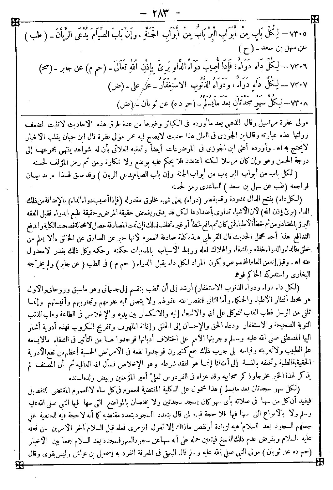 7307 - (لكل داء دواء ودواء الذنوب الاستغفار) أرشد إلى أن الطب ينقسم إلى جسماني وهو ما سبق وروحاني والأول هو محط أنظار الأطباء والحكماء وأما الثاني فتقصر عنه عقولهم ولا يتصل إليه علومهم وتجاربيهم وأقيستهم وإنما تلقى من الرسل فطب القلب التوكل على الله والالتجاء إليه والانكسار بين يديه والإخلاص في الطاعة وطب الذنب التوبة الصحيحة والاستغفار ودعاء الحق والإحسان إلى الخلق وإغاثة الملهوف وتفريج الكروب فهذه أدوية أشار إليها المصطفى صلى الله عليه وسلم وجربتها الأمم على اختلاف أديانها فوجدوا لها من التأثير في الشفاء ما لا يسعه علم الطبيب ولا تجربته وقياسه بل جرب ذلك جمع كثيرون فوجدوا نفعه في الأمراض الحسية أعظم من نفع الأدوية الحقيقية الطبية وتخلفه بالنسبة إلى أمثالنا إنما هو لفقد شرطه وهو الإخلاص نسأل الله العافية ثم إن المصنف لم يذكر لهذا الخبر مخرجا وذكر صحابيه وقد عزاه في الفردوس لعلي أمير المؤمنين وبيض ولده لسنده