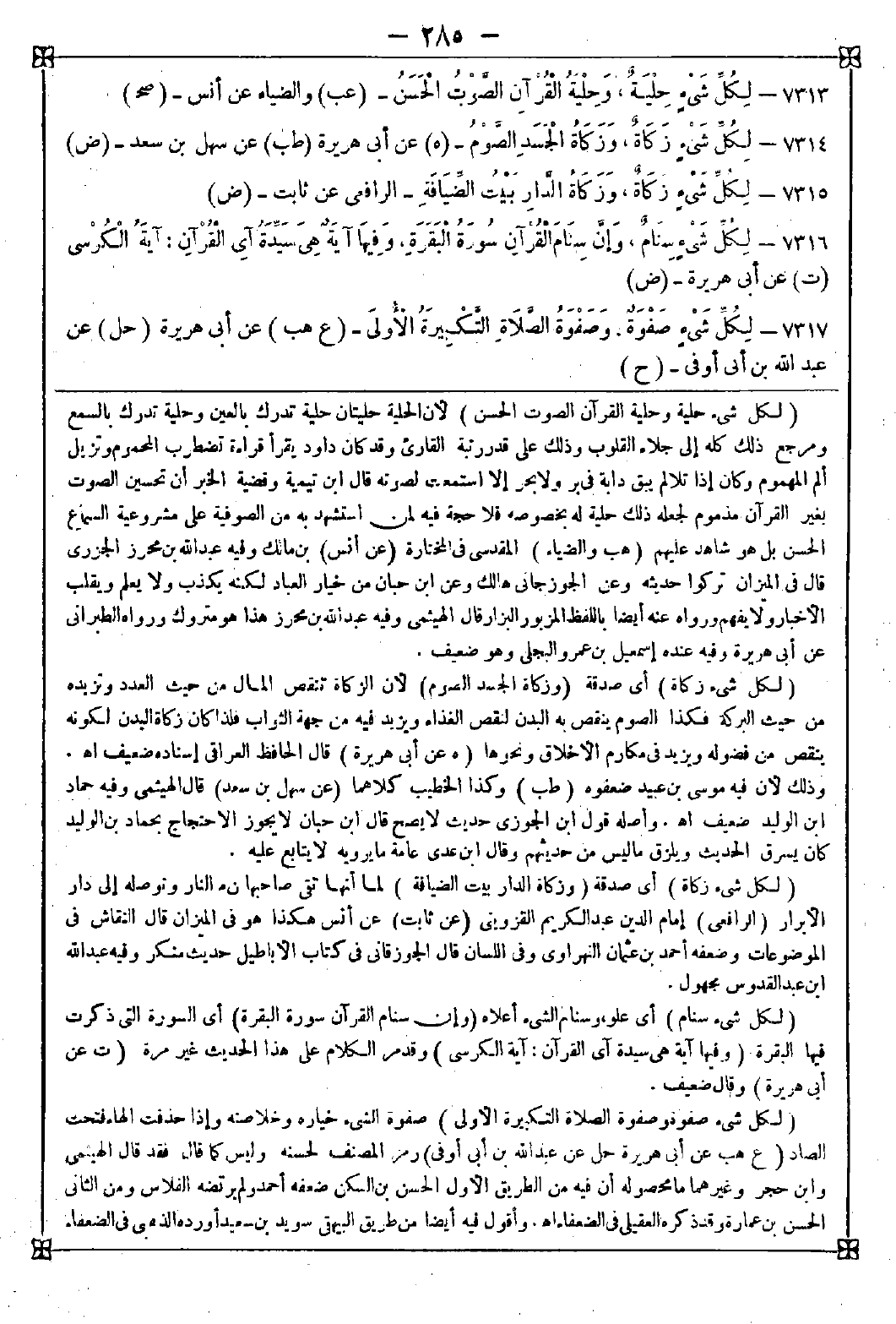 7316 - (لكل شيء سنام) أي علو وسنام الشيء أعلاه (وإن سنام القرآن سورة البقرة) أي السورة التي ذكرت فيها البقرة (وفيها آية هي سيدة آي القرآن: آية الكرسي) وقد مر الكلام على هذا الحديث غير مرة