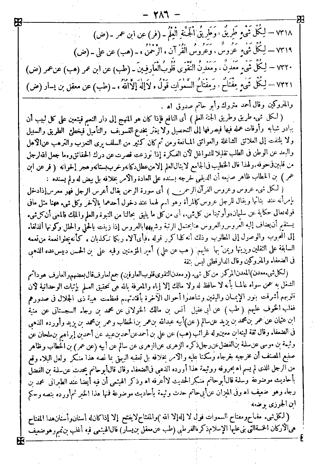 7318 - (لكل شيء طريق وطريق الجنة العلم) أي النافع فإذا كان هو المنهج إلى دار النعيم فيتعين على كل لبيب أن يبادر شبابه وأوقات عمله فيها فيصرفها إلى التحصيل ولا يغتر بخدع التسويف والتأميل فيخطئ الطريق والسبيل ولا يلتفت إلى العلائق الشاغلة والعوائق المانعة ومن ثم كان كثير من السلف يرى التعزب والترهب عن الأهل والبعد عن الوطن في الطلب تقليلا للشواغل لأن الفكرة إذا توزعت قصرت عن درك الحقائق و {ما جعل الله لرجل من قلبين في جوفه} ولهذا قال الخطيب في الجامع: لا ينال العلم إلا من عطل دكانه وخرب بستانه وهجر إخوانه