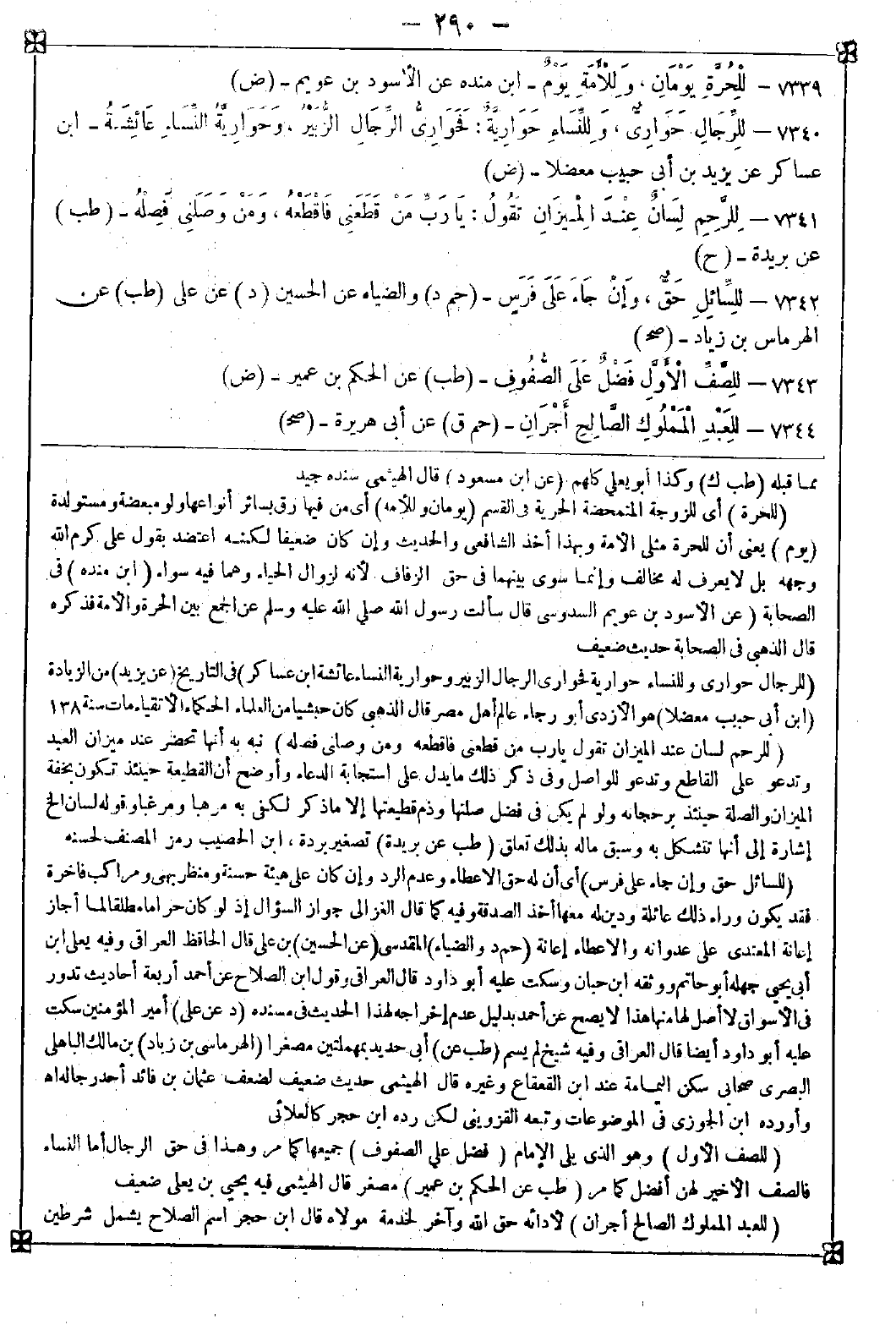 7343 - (للصف الأول) وهو الذي يلي الإمام (فضل على الصفوف) جميعها كما مر وهذا في حق الرجال أما النساء فالصف الأخير لهن أفضل كما مر