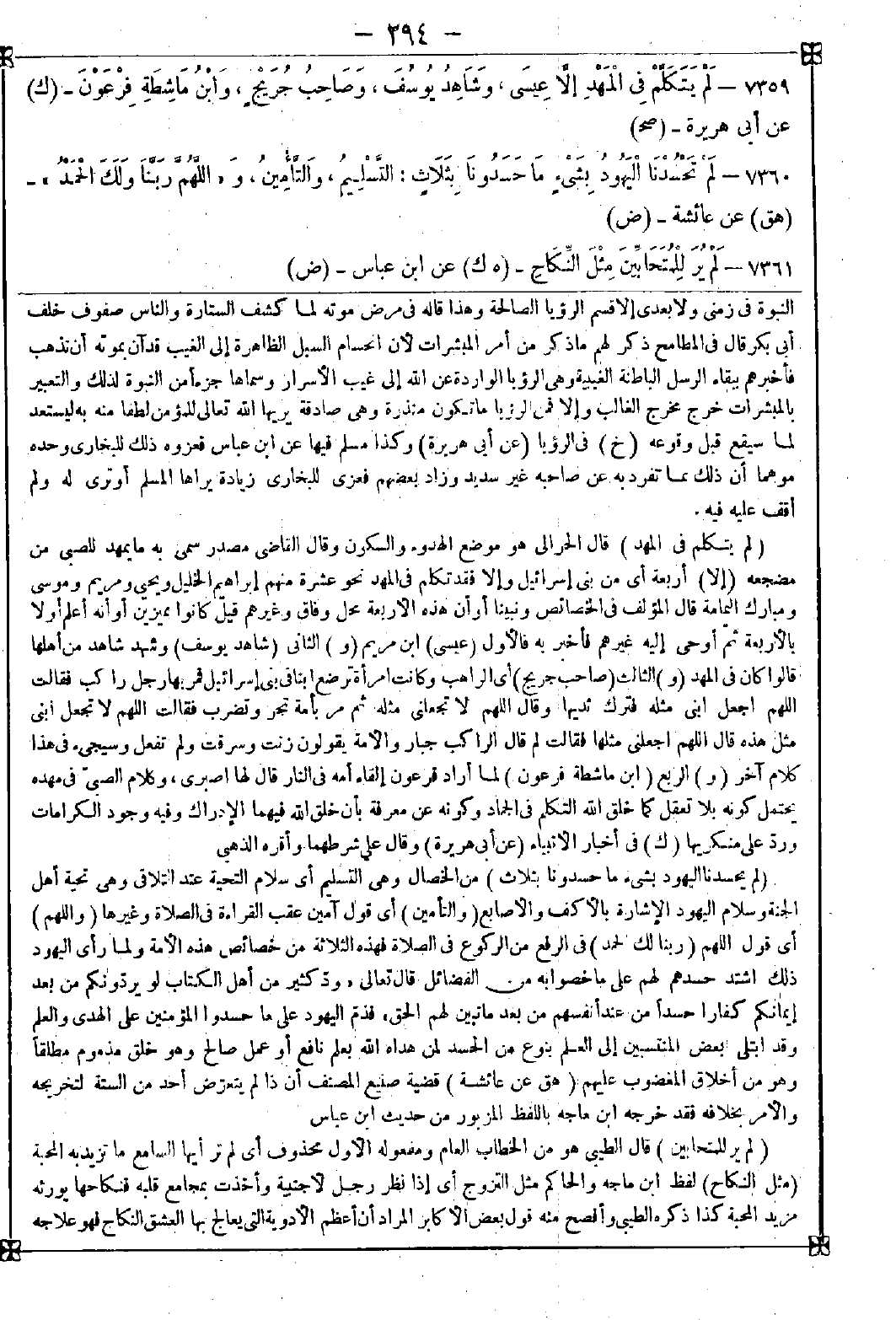 7359 - (لم يتكلم في المهد) قال الحرالي: هو موضع الهدوء والسكون وقال القاضي: مصدر سمي به ما يمهد للصبي من مضجعه (إلا) أربعة أي من بني إسرائيل وإلا فقد تكلم في المهد نحو عشرة منهم إبراهيم الخليل ويحيى ومريم وموسى ومبارك اليمامة قال المؤلف في الخصائص: ونبينا أو أن هذه الأربعة محل وفاق وغيرهم قيل كانوا مميزين أو أنه أعلم أولا بالأربعة ثم أوحى إليه غيرهم فأخبر به فالأول (عيسى) ابن مريم (و) الثاني (شاهد يوسف) وشهد شاهد من أهلها قالوا كان في المهد (و) الثالث (صاحب جريج) أي الراهب وكانت امرأة ترضع ابنا في بني إسرائيل فمر بها رجل راكب فقالت: اللهم اجعل ابني مثله فترك ثديها وقال: اللهم لا تجعلني مثله ثم مر بأمة تجر وتضرب فقالت: اللهم لا تجعل ابني مثل هذه قال: اللهم اجعلني مثلها فقالت: لم قال: الراكب جبار والأمة يقولون زنت وسرقت ولم تفعل وسيجيء في هذا كلام آخر (و) الرابع (ابن ماشطة فرعون) لما أراد فرعون إلقاء أمه في النار قال: لها اصبري وكلام الصبي في مهده يحتمل كونه بلا تعقل كما خلق الله التكلم في الجماد وكونه عن معرفة بأن خلق الله فيهما الإدراك وفيه وجود الكرامات ورد على منكريها