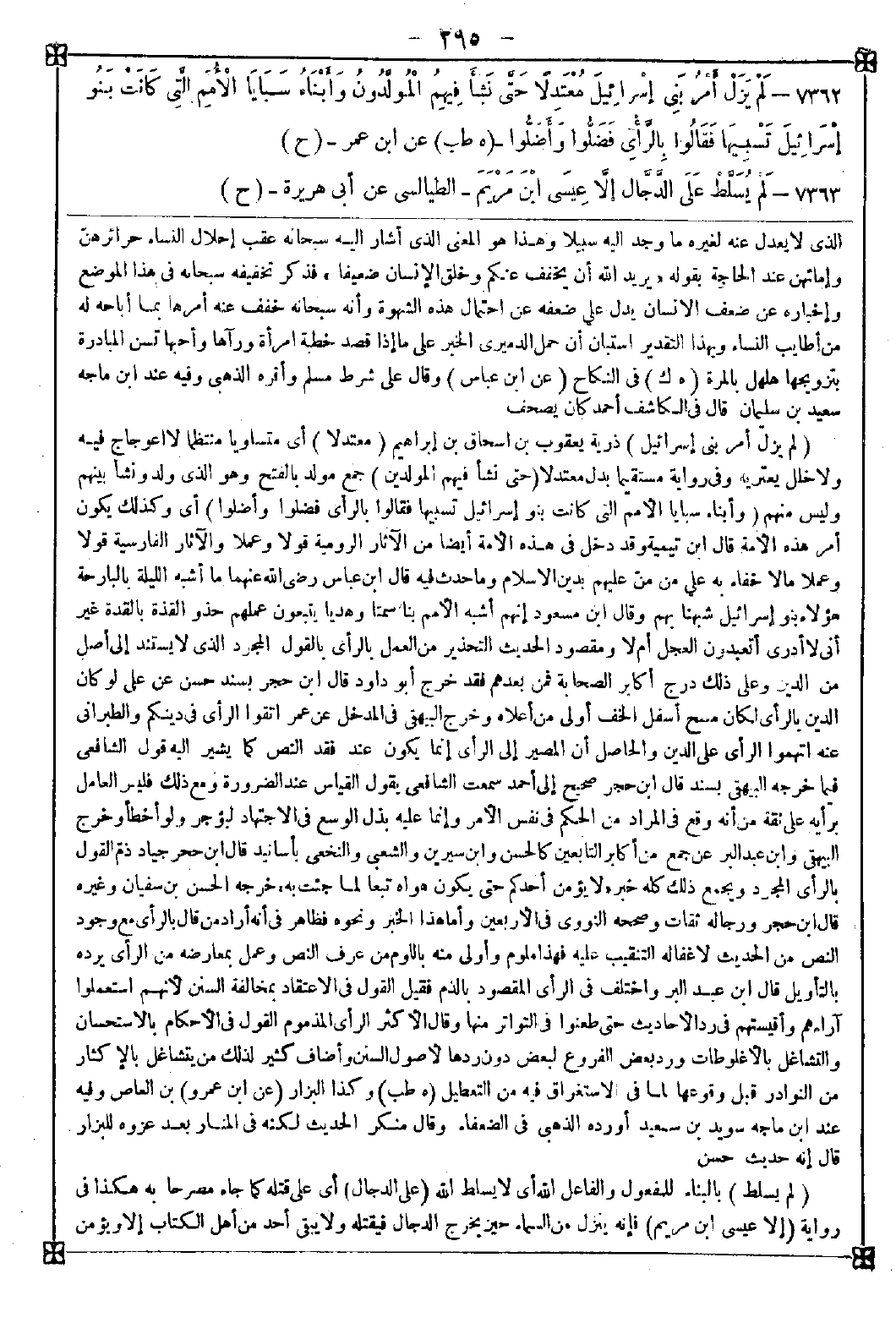 7362 - (لم يزل أمر بني إسرائيل) ذرية يعقوب بن إسحاق بن إبراهيم (معتدلا) أي متساويا منتظما لا اعوجاج فيه ولا خلل يعتريه وفي رواية مستقيما بدل معتدلا (حتى نشأ فيهم المولدين) جمع مولد بالفتح وهو الذي ولد ونشأ بينهم وليس منهم (وأبناء سبايا الأمم التي كانت بنو إسرائيل تسبيها فقالوا بالرأي فضلوا وأضلوا) أي وكذلك يكون أمر هذه الأمة. قال ابن تيمية: وقد دخل في هذه الأمة أيضا من الآثار الرومية قولا وعملا والآثار الفارسية قولا وعملا ما لا خفاء به على من من الله عليهم بدين الإسلام وما حدث فيه قال ابن عباس رضي الله عنهما: ما أشبه الليلة بالبارحة هؤلاء بنو إسرائيل شبهنا بهم وقال ابن مسعود: إنهم أشبه الأمم بنا سمتا وهديا يتبعون عملهم حذو القذة بالقدة غير أني لا أدري أتعبدون العجل أم لا ومقصود الحديث التحذير من العمل بالرأي بالقول المجرد الذي لا يستند إلى أصل من الدين وعلى ذلك درج أكابر الصحابة فمن بعدهم فقد خرج أبو داود قال ابن حجر: بسند حسن عن علي لو كان الدين بالرأي لكان مسح أسفل الخف أولى من أعلاه وخرج البيهقي في المدخل عن عمر اتقوا الرأي في دينكم والطبراني عنه اتهموا الرأي عن الدين والحاصل أن المصير إلى الرأي إنما يكون عند فقد النص كما يشير إليه قول الشافعي فيما خرجه البيهقي بسند قال ابن حجر: صحيح إلى أحمد سمعت الشافعي يقول: القياس عند الضرورة ومع ذلك فليس العامل برأيه على ثقة من أنه وقع في المراد من الحكم في نفس الأمر وإنما عليه بذل الوسع في الاجتهاد ليؤجر ولو أخطأ وخرج البيهقي وابن عبد البر عن جمع من أكابر التابعين كالحسن وابن سيرين والشعبي والنخعي بأسانيد قال ابن حجر: جياد ذم القول بالرأي المجرد ويجمع ذلك كله خبر " لا يؤمن أحدكم حتى يكون هواه تبعا لما جئت به " خرجه الحسن بن سفيان وغيره قال ابن حجر: ورجاله ثقات وصححه النووي في الأربعين وأما هذا الخبر ونحوه فظاهر في أنه أراد من قال بالرأي مع وجود النص من الحديث لإغفاله التنقيب عليه فهذا ملوم وأولى منه باللوم من عرف النص وعمل بمعارضه من الرأي يرده بالتأويل قال ابن عبد البر: واختلف قي الرأي المقصود بالذم فقيل القول في الاعتقاد بمخالفة السنن لأنهم استعملوا آراءهم وأقيستهم في رد الأحاديث حتى طعنوا في التواتر منها وقال الأكثر: الرأي المذموم القول في الأحكام بالاستحسان والتشاغل بالأغلوطات ورد بعض الفروع لبعض دون ردها لأصول السنن وأضاف كثير لذلك من يتشاغل بالإكثار من النوادر قبل وقوعها لما في الاستغراق فيه من التعطيل