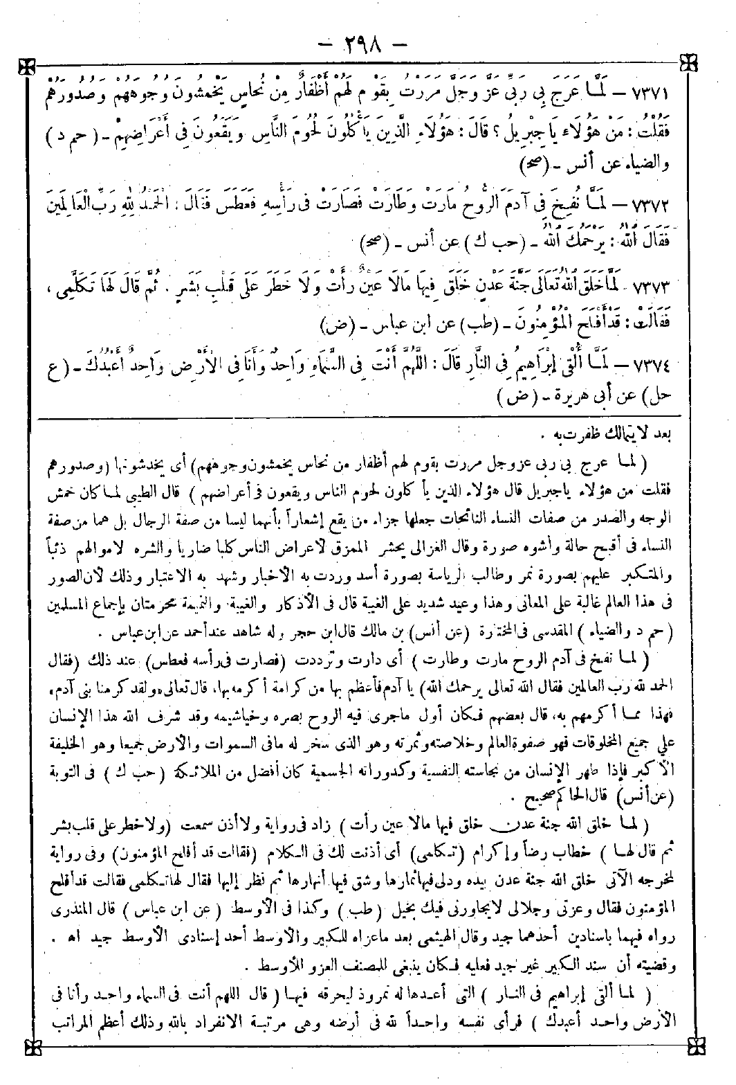 7371 - (لما عرج بي ربي عز وجل مررت بقوم لهم أظفار من نحاس يخمشون وجوههم) أي يخدشونها (وصدورهم فقلت من هؤلاء يا جبريل قال هؤلاء الذين يأكلون لحوم الناس ويقعون في أعراضهم) قال الطيبي: لما كان خمش الوجه والصدر من صفات النساء النائحات جعلها جزاء من يقع إشعارا بأنهما ليسا من صفة الرجال بل هما من صفة النساء في أقبح حالة وأشوه صورة وقال الغزالي: يحشر الممزق لأعراض الناس كلبا ضاريا والشره لأموالهم ذئبا والمتكبر عليهم بصورة نمر وطالب الرياسة بصورة أسد وردت به الأخبار وشهد به الاعتبار وذلك لأن الصور في هذا العالم غالبة على المعاني وهذا وعيد شديد على الغيبة قال في الأذكار: والغيبة والنميمة محرمتان بإجماع المسلمين