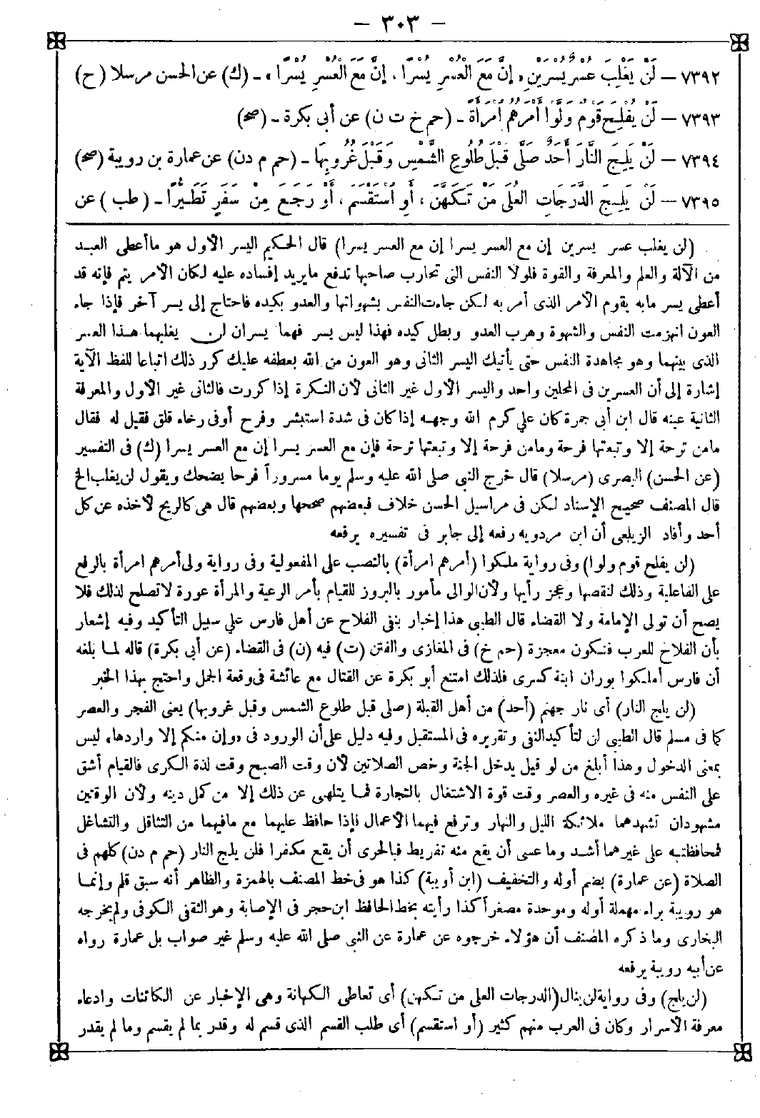 -[303]- 7392 - (لن يغلب عسر يسرين إن مع العسر يسرا إن مع العسر يسرا) قال الحكيم: اليسر الأول هو ما أعطي العبد من الآلة والعلم والمعرفة والقوة فلولا النفس التي تحارب صاحبها تدفع ما يريد إفساده عليه لكان الأمر يتم فإنه قد أعطي يسر ما به يقوم الأمر الذي أمر به لكن جاءت النفس بشهواتها والعدو بكيده فاحتاج إلى يسر آخر فإذا جاء العون انهزمت النفس والشهوة وهرب العدو وبطل كيده فهذا ليس يسر فهما يسران لن يغلبهما هذا العسر الذي بينهما وهو مجاهدة النفس حتى يأتيك اليسر الثاني وهو العون من الله بعطفه عليك كرر ذلك اتباعا للفظ الآية إشارة إلى العسرين في المحلين واحد واليسر الأول غير الثاني لأن النكرة إذا كررت فالثاني غير الأول والمعرفة الثانية عينه قال ابن أبي جمرة: كان علي كرم الله وجهه إذا كان في شدة استبشر وفرح أو في رخاء قلق فقيل له فقال: ما من ترحة إلا وتبعتها فرحة وما من فرحة إلا وتبعتها ترحة فإن مع العسر يسرا إن مع العسر يسرا