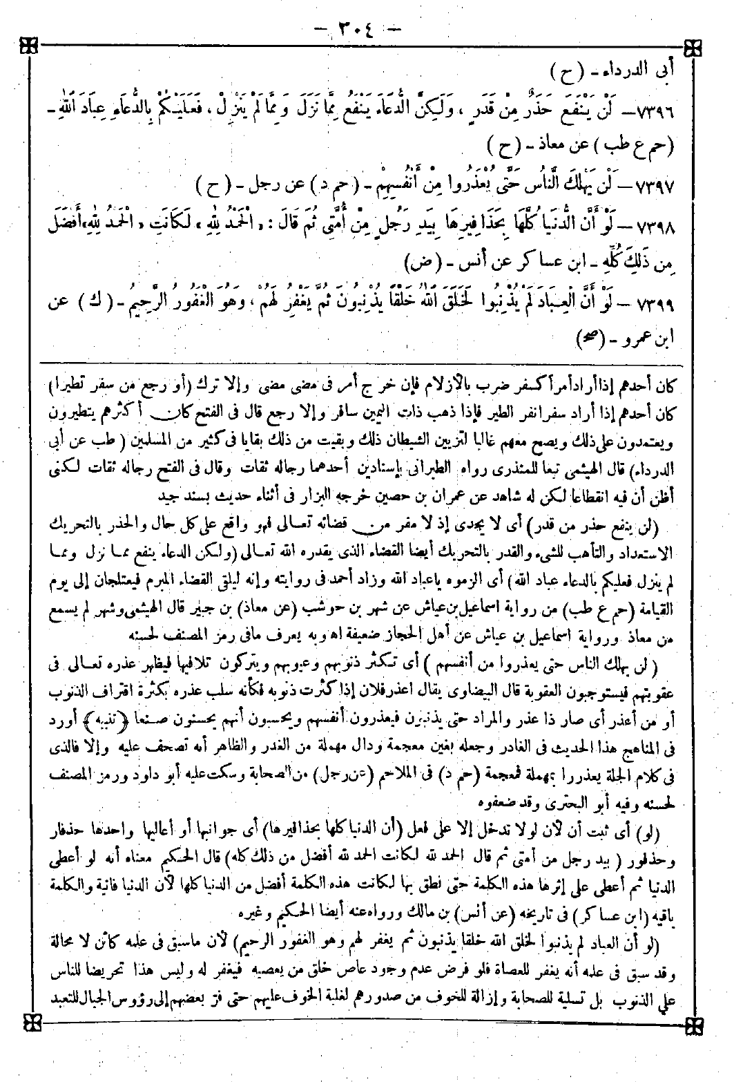 7396 - (لن ينفع حذر من قدر) أي لا يجدي إذ لا مفر من قضائه تعالى فهو واقع على كل حال والحذر بالتحريك الاستعداد والتأهب للشيء والقدر بالتحريك أيضا القضاء الذي يقدره الله تعالى (ولكن الدعاء ينفع مما نزل ومما لم ينزل فعليكم بالدعاء عباد الله) أي الزموه يا عباد الله وزاد أحمد في روايته وإنه ليلقى القضاء المبرم فيعتلجان إلى يوم القيامة