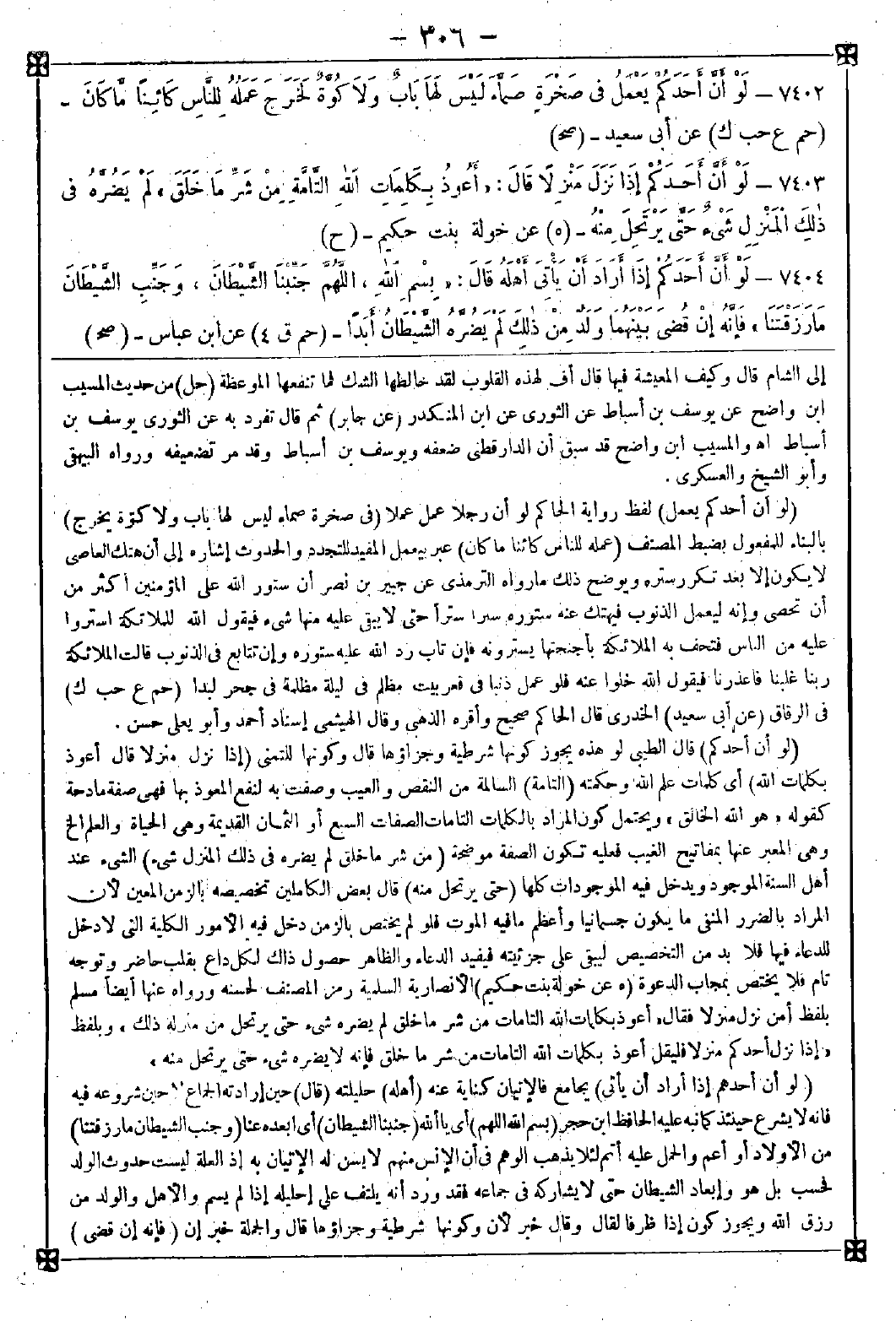 7403 - (لو أن أحدكم) قال الطيبي: لو هذه يجوز كونها شرطية وجزاؤها قال: وكونها للتمني (إذا نزل منزلا قال أعوذ بكلمات الله) أي كلمات علم الله وحكمته (التامة) السالمة من النقص والعيب وصفت به لنفع المعوذ بها فهي صفة مادحة كقوله {هو الله الخالق) ويحتمل كون المراد بالكلمات التامات الصفات السبع أو الثمان القديمة وهي الحياة والعلم إلخ وهي المعبر عنها بمفاتيح الغيب فعليه تكون الصفة موضحة (من شر ما خلق لم يضره في ذلك المنزل شيء) الشيء عند أهل السنة الموجود ويدخل فيه الموجودات كلها (حتى يرتحل منه) قال بعض الكاملين: تخصيصه بالزمن المعين لأن المراد بالضرر المنفي ما يكون جسمانيا وأعظم ما فيه الموت فلو لم يختص بالزمن دخل فيه الأمور الكلية التي لا دخل للدعاء فيها فلا بد من التخصيص ليبقى على جزئيته فيفيد الدعاء والظاهر حصول ذلك لكل داع بقلب حاضر وتوجه تام فلا يختص بمجاب الدعوة