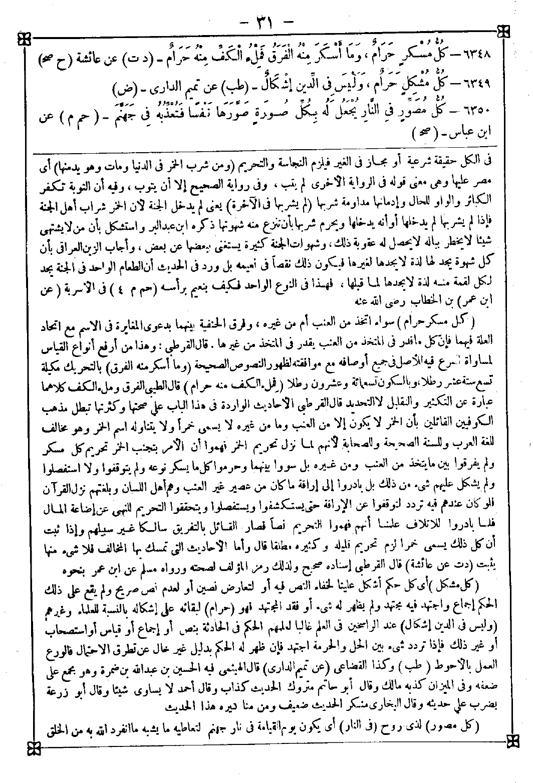 6348 - (كل مسكر حرام) سواء اتخذ من العنب أم من غيره وفرق الحنفية بينهما بدعوى المغايرة في الاسم مع اتحاد العلة فيهما فإن كل ما قدر في المتخذ من العنب يقدر في المتخذ من غيرها. قال القرطبي: وهذا من أرفع أنواع القياس لمساواة الفرع فيه للأصل في جميع أوصافه مع موافقته لظهور النصوص الصحيحة (وما أسكر منه الفرق) بالتحريك مكيلة تسع ستة عشر رطلا وبالسكون تسع مئة وعشرون رطلا (فملء الكف منه حرام) قال الطيبي: الفرق وملء الكف كلاهما عبارة عن التكثير والتقليل لا التحديد قال القرطبي: الأحاديث الواردة في هذا الباب على صحتها وكثرتها تبطل مذهب الكوفيين القائلين بأن الخمر لا يكون إلا من العنب وما من غيره لا يسمى خمرا ولا يتناوله اسم الخمر وهو مخالف للغة العرب وللسنة الصحيحة وللصحابة لأنهم لما نزل تحريم الخمر فهموا أن الأمر بتجنب الخمر تحريم كل مسكر ولم يفرقوا بين ما يتخذ من العنب ومن غيره بل سووا بينهما وحرموا كل ما يسكر نوعه ولم يتوقفوا ولا استفصلوا ولم يشكل عليهم شيء من ذلك بل بادروا إلى إراقة ما كان من عصير غير العنب وهم أهل اللسان وبلغتهم نزل القرآن فلو كان عندهم فيه تردد لتوقفوا عن الإراقة حتى يستكشفوا ويستفصلوا ويتحققوا التحريم للنهي عن إضاعة المال فلما بادروا للإتلاف علمنا أنهم فهموا التحريم نصا فصار القائل بالتفريق سالكا غير سبيلهم وإذا ثبت أن كل ذلك يسمى خمرا لزم تحريم قليله وكثيره مطلقا قال: وأما الأحاديث التي تمسك بها المخالف فلا شيء منها يثبت