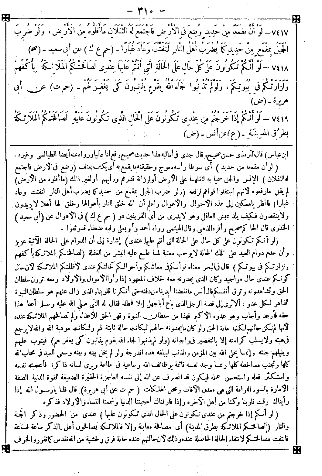 7419 - (لو أنكم إذا خرجتم من عندي تكونون على الحال الذي تكونون عليها) عندي من الحضور وذكر الجنة والنار (لصافحتكم الملائكة بطرق المدينة) أي مصافحة معاينة وإلا فالملائكة يصافحون أهل الذكر ساعة فساعة فاتنفت مصافحتكم لانتفاء الحالة الحاصلة عنده وذلك لأن حالتهم عنده فرق وخشية من الله كما تقرر والخوف -[311]- سبب لولوج نور اليقين في القلب وذا سبب لموت الشهوة ورفع الحجب وحينئذ يشاهد الأرواح الطاهرة المطهرة عيانا لارتفاع الموانع ذكره بعض الكاملين وقال البوني: سر ذلك أن المصطفى صلى الله عليه وسلم مجمع الأنوار فإذا كان في مجلسه يتلقى كل منهم من أنواره ما في قوته فكأنهم في الغيبة والحضور يشاهدون ذلك على العيان لاجتماع المقامات والأطوار النورانية في وقت واحد فإذا رجعوا إلى مواطن أجسامهم ومراكز حسهم نقص ذلك وهو بالحقيقة لم ينقص بل أخذ كل منهم ما رجع به إلى عالمه لكن لما كان الحسن أغلب في الرجعة إلى الأهل كان الحكم غالبا في الظاهر لا الباطن ألا ترى أنهم إذا حضروا ثانيا تذكروا ما بطن عنهم بزيادة الفهم عن الله