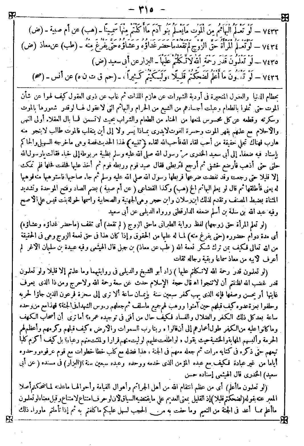 7435 - (لو تعلمون قدر رحمة الله لاتكلتم عليها) زاد أبو الشيخ [ابن حبان] والديلمي في روايتيهما وما علمتم إلى قليلا ولو تعلمون قدر غضب الله لظننتم أن لا تنجوا اه. قال حجة الإسلام: حدث عن سعة رحمة الله ولا حرج ومن ذا الذي يعرف غايتها أو يحسن وصفها فإنه الذي يهب كفر سبعين سنة بإيمان ساعة ألا ترى إلى سحرة فرعون الذين جاؤوا لحربه وحلفوا بعزة عدوه كيف قبلهم حين آمنوا ووهب لهم جميع ما سلف ثم جعلهم رؤوس الشهداء في الجنة؟ فهذا مع من وحده ساعة بعد كل ذلك الكفر والضلال والفساد فكيف حال من أفنى في توحيده عمره؟ أما ترى أن أصحاب الكهف وما كانوا عليه من الكفر طول أعمارهم إلى أن قالوا: {ربنا رب السماوات والأرض} كيف قبلهم وكرمهم وأعظم لهم الحرمة وألبسهم المهابة والخشية حيث يقول: {لو اطلعت عليهم لوليت منهم فرارا ولملئت منهم رعبا} بل كيف أكرم كلبا تبعهم حتى ذكره في كتابه مرات ثم جعله معهم في الجنة هذا فضله مع كلب خطا خطوات مع قوم عرفوه ووحدوه أياما من غير عبادة فكيف مع عبده المؤمن الذي خدمه ووحده وعبده سبعين سنة؟