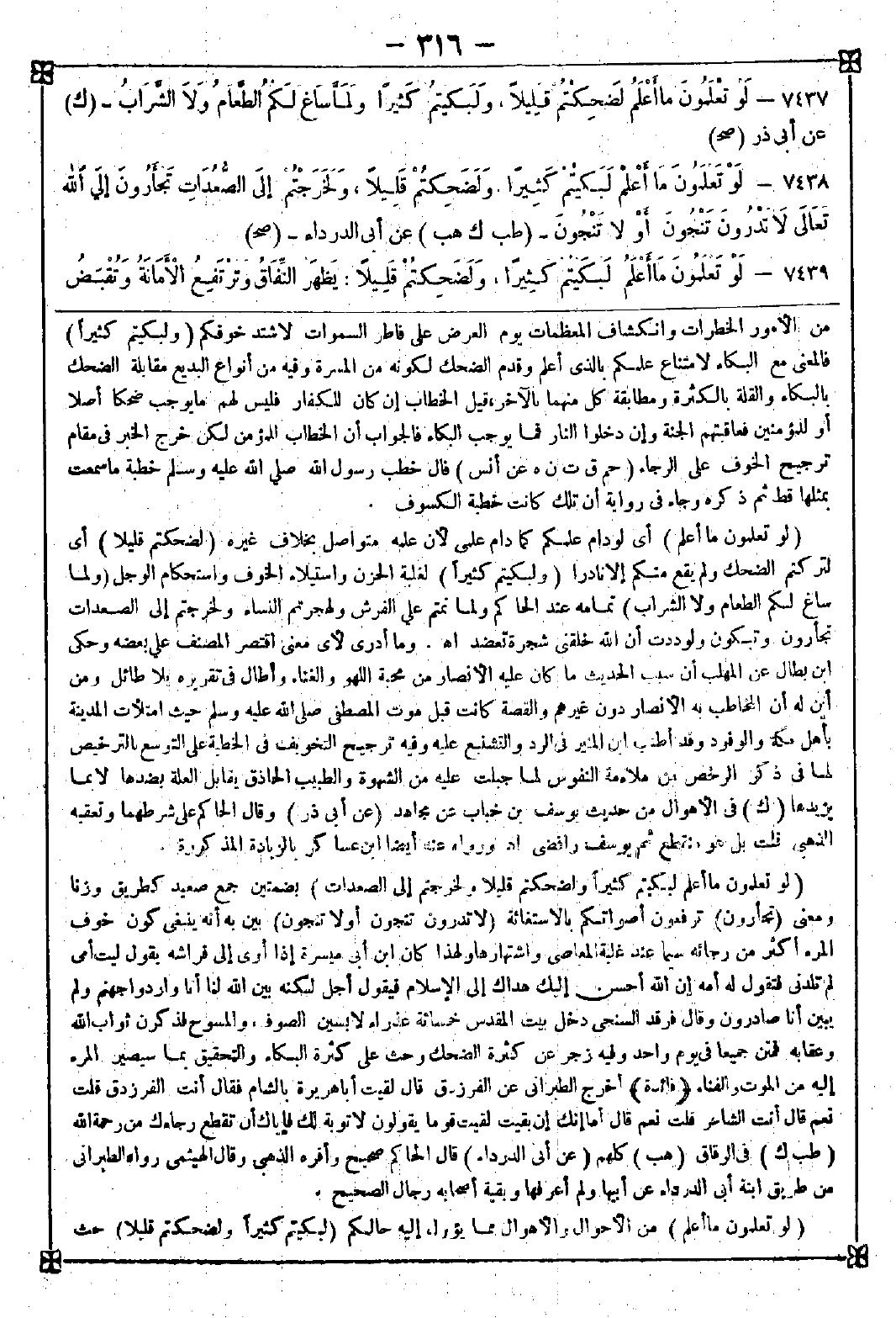 7437 - (لو تعلمون ما أعلم) أي لو دام علمكم كما دام علمي لأن علمه متواصل بخلاف غيره (لضحكتم قليلا) أي لتركتم الضحك ولم يقع منكم إلا نادرا (ولبكيتم كثيرا) لغلبة الحزن واستيلاء الخوف واستحكام الوجل (ولما ساغ لكم الطعام ولا الشراب) تمامه عند الحاكم ولما نمتم على الفرش ولهجرتم النساء ولخرجتم إلى الصعدات تجأرون وتبكون ولوددت أن الله خلقني شجرة تعضد اه. وما أدري لأي معنى اقتصر المصنف على بعضه وحكى ابن بطال عن المهلب أن سبب الحديث ما كان عليه الأنصار من محبة اللهو والغناء وأطال في تقريره يلا طائل ومن أين له أن المخاطب به الأنصار دون غيرهم والقصة كانت قبل موت المصطفى صلى الله عليه وسلم حيث امتلأت المدينة بأهل مكة والوفود وقد أطنب ابن المنير في الرد والتشنيع عليه وفيه ترجيح التخويف في الخطبة على التوسع بالترخيص لما في ذكر الرخص من ملاءمة النفوس لما جبلت عليه من الشهوة والطبيب الحاذق يقابل العلة بضدها لا بما يزيدها