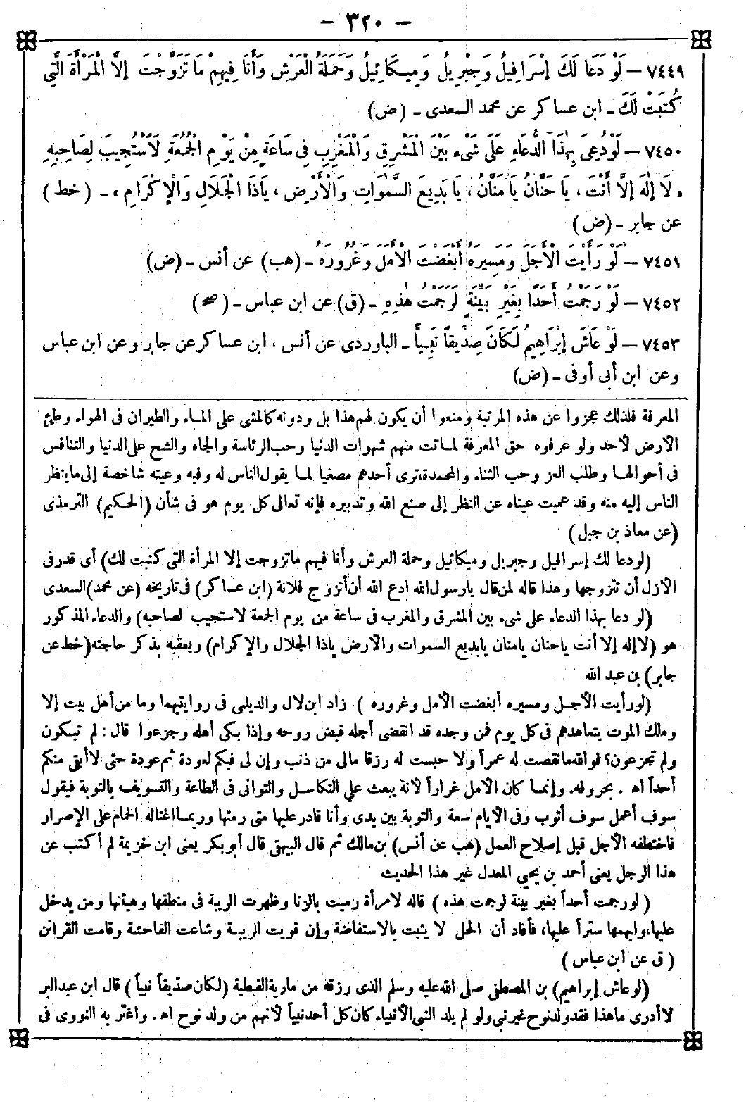 7449 - (لو دعا لك إسرافيل وجبريل وميكائيل وحملة العرش وأنا فيهم ما تزوجت إلا المرأة التي كتبت لك) أي قدر في الأزل أن تتزوجها وهذا قاله لمن قال: يا رسول الله ادع الله أن أتزوج فلانة