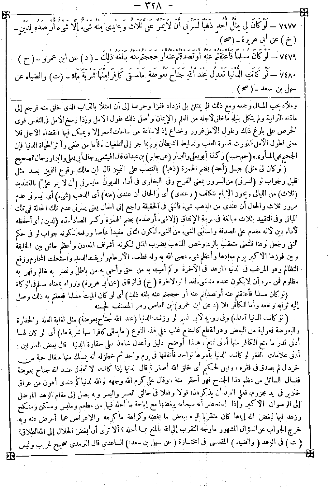 7478 - (لو كان لي مثل) جبل (أحد) بضم الهمزة (ذهبا) بالنصب على التمييز قال ابن مالك بوقوع التمييز بعد مثل قليل وجواب لو (لسرني) من السرور بمعنى الفرح وفي البخاري في أداء الديون ما يسرني (أن لا يمر علي) بالتشديد (ثلاث) من الليالي ويجوز الأيام بتكلف (وعندي) أي والحال أن عندي (منه) أي الذهب (شيء) أي ليسرني عدم مرور ثلاث والحال أن عندي من الذهب شيء فالنفي في الحقيقة راجع إلى الحال يعني يسرني عدم تلك الحالة في تلك الليالي وفي التقييد بثلاث مبالغة في سرعة الإنفاق (إلا شيء أرصده) بضم الهمزة وكسر الصاد أعده (لدين) أي أحفظه لأداء دين لأنه مقدم على الصدقة واستثنى الشيء من الشيء لكون الثاني مقيدا خاصا ورفعه لكونه جواب لو في حكم النفي وجعل لو هنا للتمني متعقب بالرد وخص الذهب بضرب المثل لكونه أشرف المعادن وأعظم حائل بين الخليقة وبين فوزها الأكبر يوم معادها وأعظم شيء عصى الله به وله قطعت الأرحام وأريقت الدماء واستحلت المحارم ووقع التظالم وهو المرغب في الدنيا المزهد في الآخرة وكم أميت به من حق وأحيي به من باطل ونصر به ظالم وقهر به مظلوم فمن سره أن لا يكون عنده منه شيء فقد آثر الآخرة