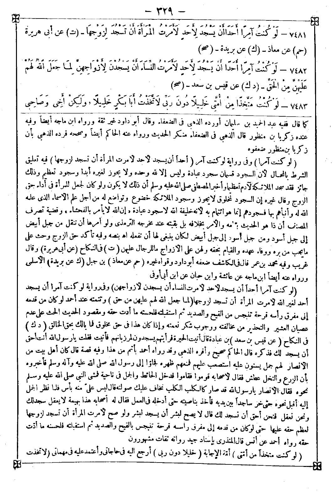 7482 - (لو كنت آمرا أحدا أن يسجد لأحد لأمرت النساء أن يسجدن لأزواجهن) وفي رواية لو كنت آمرا أن يسجد أحد لغير الله لأمرت المرأة أن تسجد لزوجها (لما جعل الله لهم عليهن من حق) وتتمته عند أحمد لو كان من قدمه إلى مفرق رأسه قرحة تنبجس من القيح والصديد ثم استقبلته فلحسته ما أدت حقه ومقصود الحديث الحث على عدم عصيان العشير والتحذير من مخالفته ووجوب شكر نعمته وإذا كان هذا في حق مخلوق فما بالك بحق الخالق