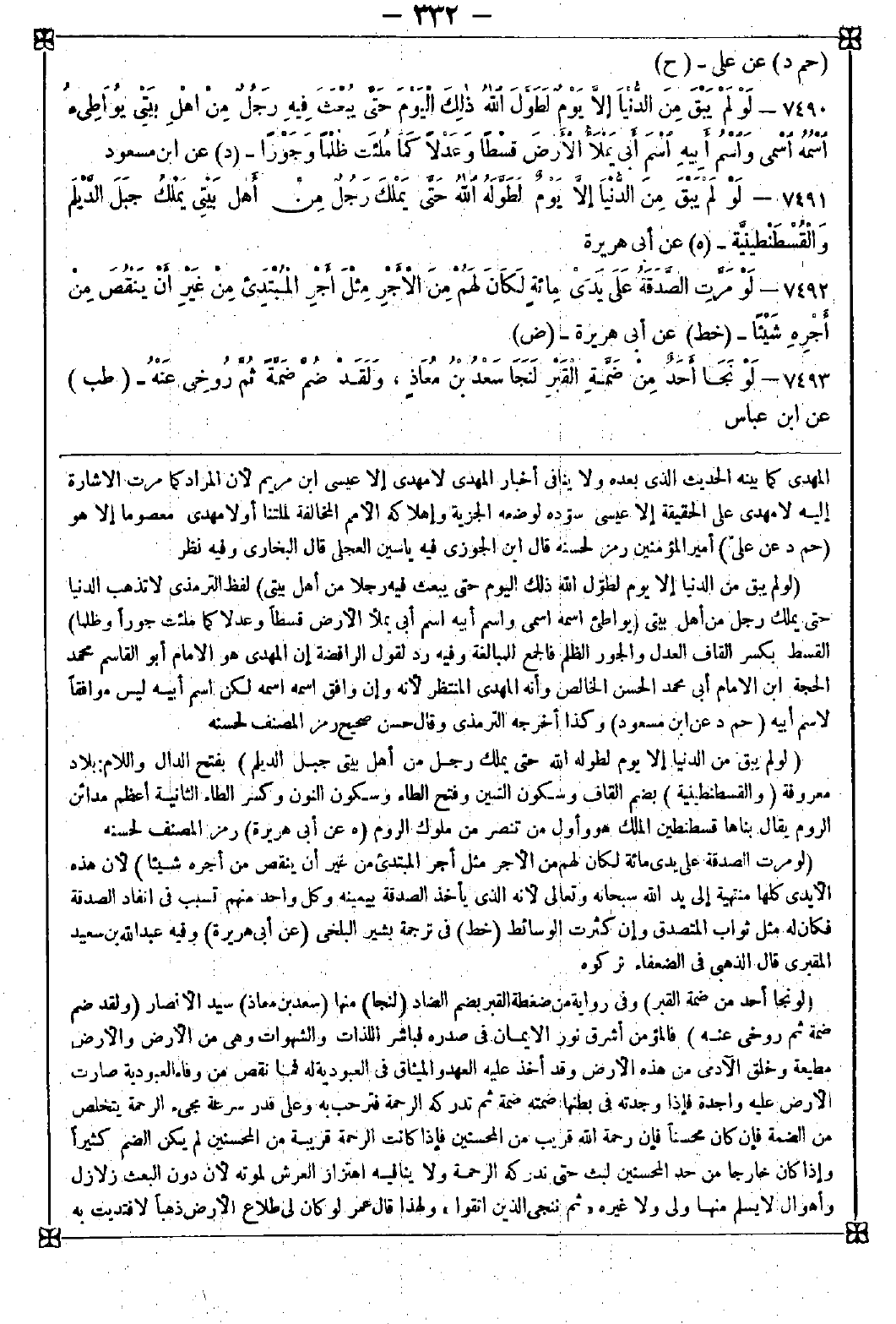 7491 - (لو لم يبق من الدنيا إلا يوم لطوله الله حتى يملك رجل من أهل بيتي جبل الديلم) بفتح الدال واللام بلاد معروفة (والقسطنطينية) بضم القاف وسكون السين وفتح الطاء وسكون النون وكسر الطاء الثانية أعظم مدائن الروم يقال بناها قسطنطين الملك وهو أول من تنصر من ملوك الروم