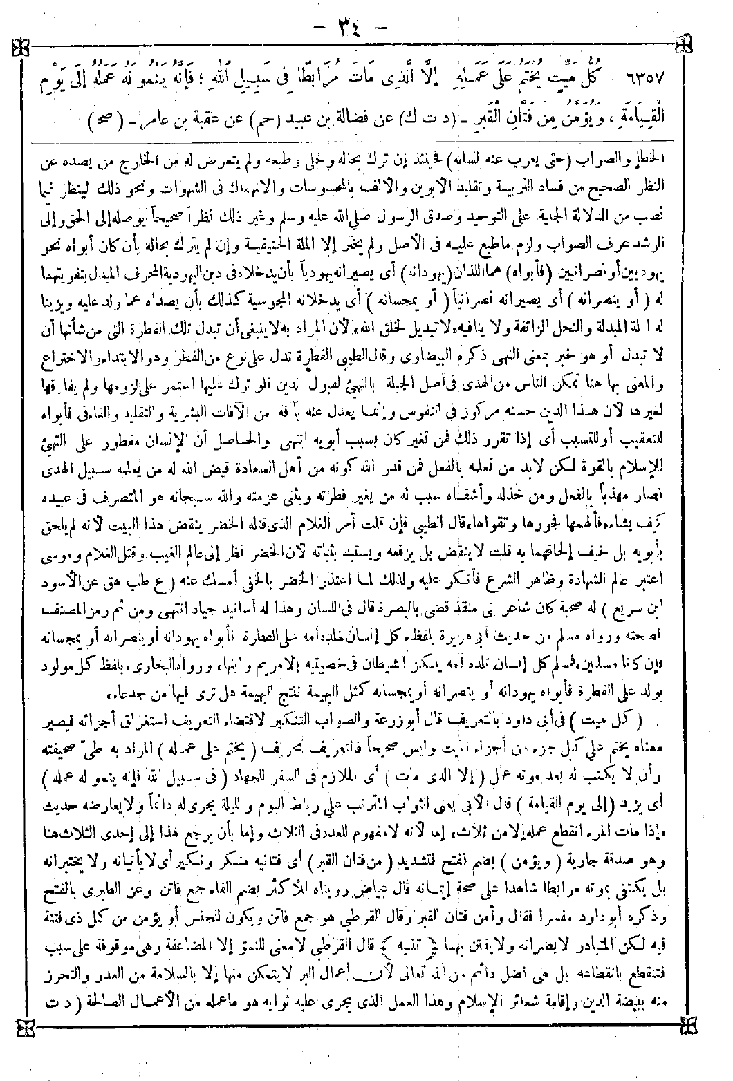 6357 - (كل ميت) في أبي داود بالتعريف قال أبو زرعة: والصواب التنكير لاقتضاء التعريف استغراق أجزائه فيصير معناه يختم على كل جزء من أجزاء الميت وليس صحيحا فالتعريف تحريف (يختم على عمله) المراد به طي صحيفته وأن لا يكتب له بعد موته عمل (إلا الذي مات) أي الملازم في السفر للجهاد (في سبيل الله فإنه ينمو له عمله) أي يزيد (إلى يوم القيامة) قال الأبي: يعني الثواب المترتب على رباط اليوم والليلة يجري له دائما ولا يعارضه حديث " إذا مات المرء انقطع عمله إلا من ثلاث " إما لأنه لا مفهوم للعدد في الثلاث وإما بأن يرجع هذا إلى إحدى الثلاث هنا وهو صدقة جارية (ويؤمن) بضم ففتح فتشديد (من فتان القبر) أي فتانيه منكر ونكير أي لا يأتيانه ولا يختبرانه بل يكتفى بموته مرابطا شاهدا على صحة إيمانه قال عياض: رويناه للأكثر بضم الفاء وجمع فاتن وعن الطبري بالفتح وذكره أبو داود مفسرا فقال: وأمن فتان القبر وقال القرطبي: هو جمع فاتن ويكون للجنس أو يؤمن من كل ذي فتنة فيه لكن المتبادر لا يضرانه ولا يفتن بهما <تنبيه> قال القرطبي: لا معنى للنمو إلا المضاعفة وهي موقوفة على سبب فتنقطع بانقطاعه بل هي فضل دائم من الله تعالى لأن أعمال البر لا يتمكن منها إلا بالسلامة من العدو والتحرز منه ببيضة الدين وإقامة شعائر الإسلام وهذا العمل الذي يجري عليه ثوابه هو ما عمله من الأعمال الصالحة