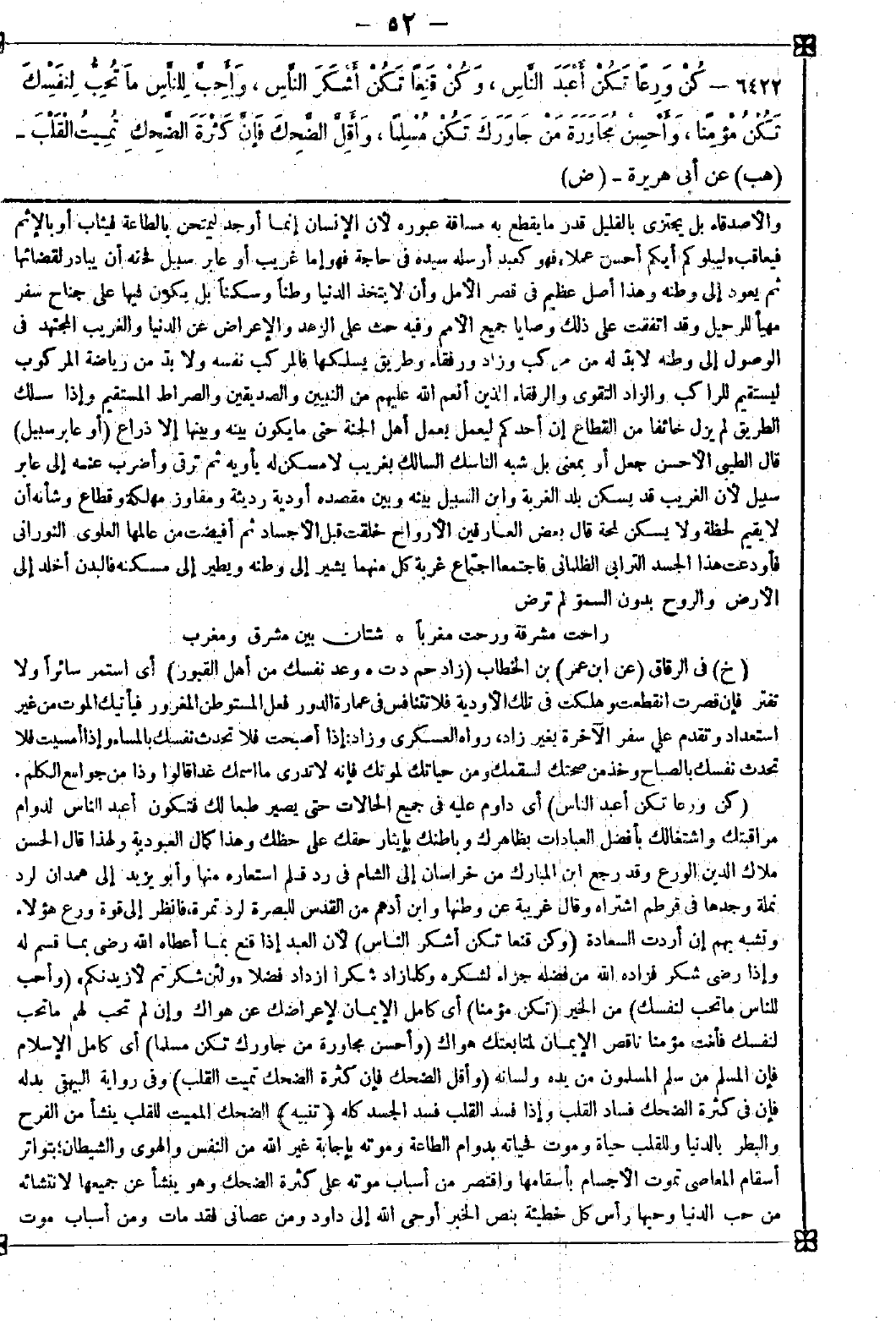 6422 - (كن ورعا تكن أعبد الناس) أي داوم عليه في جميع الحالات حتى يصير طبعا لك فتكون أعبد الناس لدوام مراقبتك واشتغالك بأفضل العبادات بظاهرك وباطنك بإيثار حقك على حظك وهذا كمال العبودية ولهذا قال الحسن: ملاك الدين الورع وقد رجع ابن المبارك من خراسان إلى الشام في رد قلم استعاره منها وأبو يزيد إلى همدان لرد نملة وجدها في قرطم اشتراه وقال: غريبة عن وطنها وابن أدهم من القدس للبصرة لرد تمرة فانظر إلى قوة ورع هؤلاء وتشبه بهم إن أردت السعادة (وكن قنعا تكن أشكر الناس) لأن العبد إذا قنع بما أعطاه الله رضي بما قسم له وإذا رضي شكر فزاده الله من فضله جزاء لشكره وكلما زاد شكرا ازداد فضلا {لئن شكرتم لأزيدنكم} (وأحب للناس ما تحب لنفسك) من الخير (تكن مؤمنا) أي كامل الإيمان لإعراضك عن هواك وإن لم تحب لهم ما تحب لنفسك فأنت مؤمنا ناقص الإيمان لمتابعتك هواك (وأحسن مجاورة من جاورك تكن مسلما) أي كامل الإسلام فإن المسلم من سلم المسلمون من يده ولسانه (وأقل الضحك فإن كثرة الضحك تميت القلب) وفي رواية البيهقي بدله فإن في كثرة الضحك فساد لقلب وإذا فسد القلب فسد الجسد كله. <تنبيه> الضحك المميت للقلب ينشأ من الفرح والبطر بالدنيا وللقلب حياة وموت فحياته بدوام الطاعة وموته بإجابة غير الله من النفس والهوى والشيطان بتواتر أسقام المعاصي تموت الأجسام بأسقامها واقتصر من أسباب موته على كثرة الضحك وهو ينشأ عن جميعها لانتشائه من حب الدنيا وحبها رأس كل خطيئة بنص الخبر أوحى الله إلى داود ومن عصاني فقد مات ومن أسباب موت -[53]- القلب الأشر والبطر والفرح وإذا مات لم يستجب له الله إذا دعاه