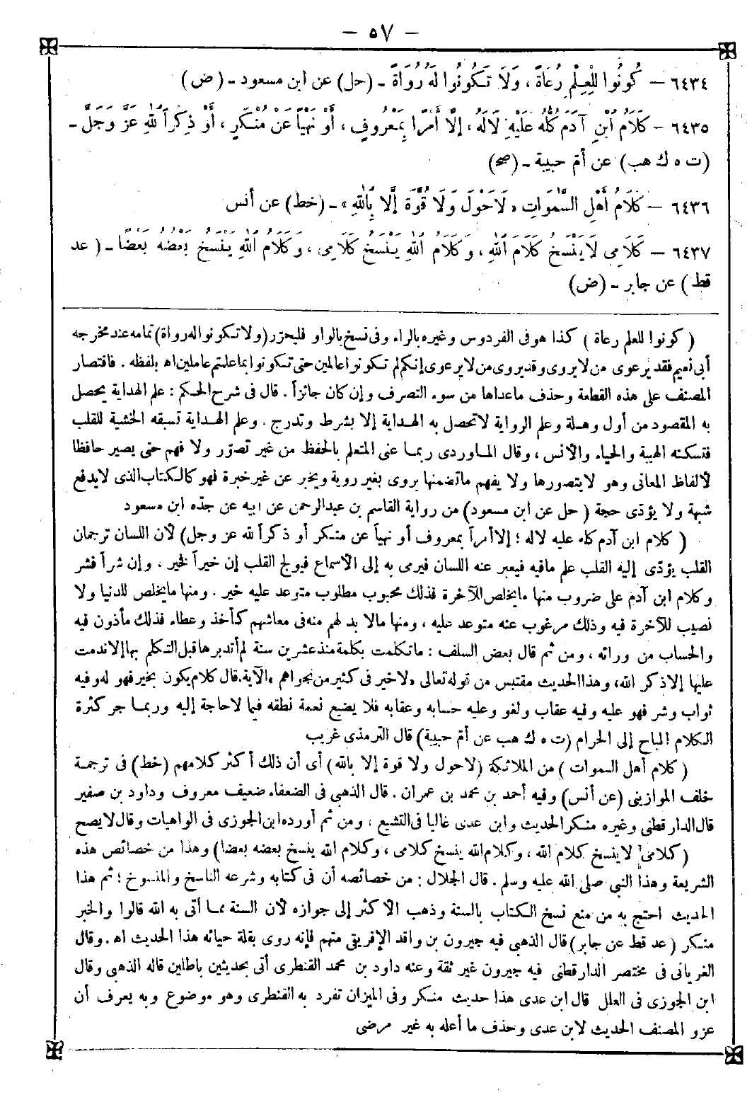 -[57]- 6434 - (كونوا للعلم رعاة) كذا هو في الفردوس وغيره بالراء وفي نسخ بالواو فليحرر (ولا تكونوا له رواة) تمامه عند مخرجه أبي نعيم فقد يرعوي من لا يروى وقد يروى من لا يرعوي إنكم لم تكونوا عالمين حتى تكونوا بما علمتم عاملين اه بلفظه. فاقتصار المصنف على هذه القطعة وحذف ما عداها من سوء التصرف وإن كان جائزا. قال في شرح الحكم: علم الهداية يحصل به المقصود من أوله وهلة وعلم الرواية لا تحصل به الهداية إلا بشرط وتدرج. وعلم الهداية تسبقه الخشية للقلب فتسكنه الهيبة والحياء والأنس وقال الماوردي: ربما عنى المتعلم بالحفظ من غير تصور ولا فهم حتى يصير حافظا لألفاظ المعاني وهو لا يتصورها ولا يفهم ما تضمنها يروي بغير روية ويخير عن غير خبرة فهو كالكتاب الذي لا يدفع شبهة ولا يؤدي حجة
