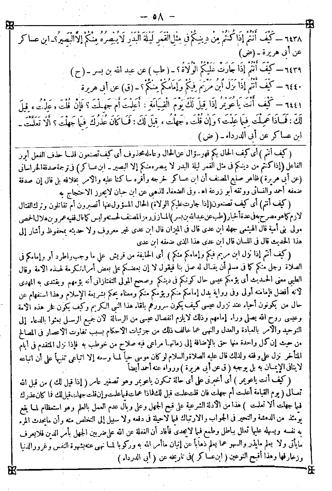 -[58]- 6438 - (كيف أنتم) أي كيف الحال بكم فهو سؤال عن الحال وعامله محذوف أي كيف تصنعون فلما حذف الفعل أبرز الفاعل (إذا كنتم من دينكم في مثل القمر ليلة البدر لا يبصره منكم إلا البصير)