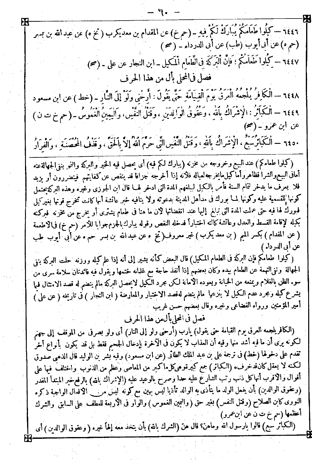 6449 - (الكبائر) جمع كبيرة وهي كل ما كبر من المعاصي وعظم من الذنوب واختلف فيها على أقوال والأقرب أنها كل ذنب رتب الشارع عليه حدا وصرح بالوعيد عليه (الإشراك بالله) بالرفع خبر المبتدأ المقدر (وعقوق الوالدين) بأن يفعل الولد ما يتأذى به الوالد تأذيا ليس بهين مع كونه ليس من الأفعال الواجبة ذكره النووي كابن الصلاح (وقتل النفس) بغير حق (واليمين الغموس) والواو في الأربعة للعطف على السابق والشرك أعظمها