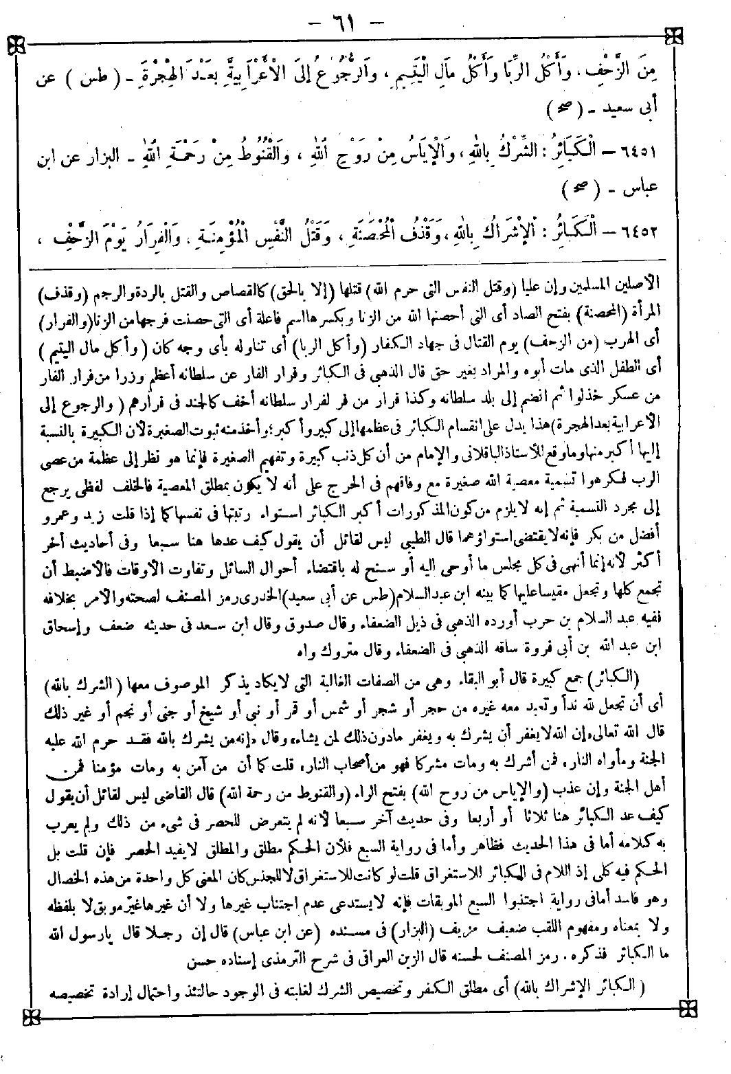 6452 - (الكبائر الإشراك بالله) أي مطلق الكفر وتخصيص الشرك لغلبته في الوجود حالتئذ واحتمال إرادة تخصيصه -[62]- رد بأن بعض الكفر أقبح من الشرك وهو التعطيل لأنه نفي مطلق والإشراك إثبات مقيد (وقذف المحصنة وقتل النفس المؤمنة والفرار يوم الزحف) أي الإدبار للفرار يوم الازدحام للقتال والزحف الجماعة الذين يزحفون أي يمشون بمشقة (وأكل مال اليتيم وعقوق الوالدين المسلمين) مصدر عق والده يعق عقوقا فهو عاق أذاه وعصاه وخرج عليه (وإلحاد بالبيت) أي ميل عن الحق في الكعبة أي حرمها (قبلتكم أحياءا وأمواتا) فيه انقسام الذنوب إلى كبير وأكبر فيفيد ثبوت الصغائر لأن الكبيرة بالنسبة إليها أكبر منها وقد فهم الفرق بين الكبيرة والصغيرة من مدارك الشرع وقد جاء في عدة أخبار ما يكفر الخطايا ما لم يكن كبائر فثبت به أن من الذنوب ما يكفر بالطاعة ومنها ما لا يكفر وذلك عين المدعي ولهذا قال حجة الإسلام: إنكار الفرق بين الكبيرة والصغيرة لا يليق بفقيه واعلم أن هذا الحديث قد روى بأتم من هذا ولفظه الكبائر تسع الشرك بالله وقتل مؤمن بغير حق وفرار يوم الزحف وأكل مال اليتيم وأكل الربا وقذف المحصنة وعقوق الوالدين المسلمين واستحلال البيت الحرام قبلتكم ما من رجل يموت لم يعمل هؤلاء الكبائر ويقيم الصلاة ويؤتي الزكاة إلا كان مع النبي صلى الله عليه وسلم في دار أبوابها مصاريع من ذهب قال الذهبي في الكبائر: إسناده صحيح ووضع عليه علامة أبي داود والنسائي فكان ينبغي للمؤلف إيثاره