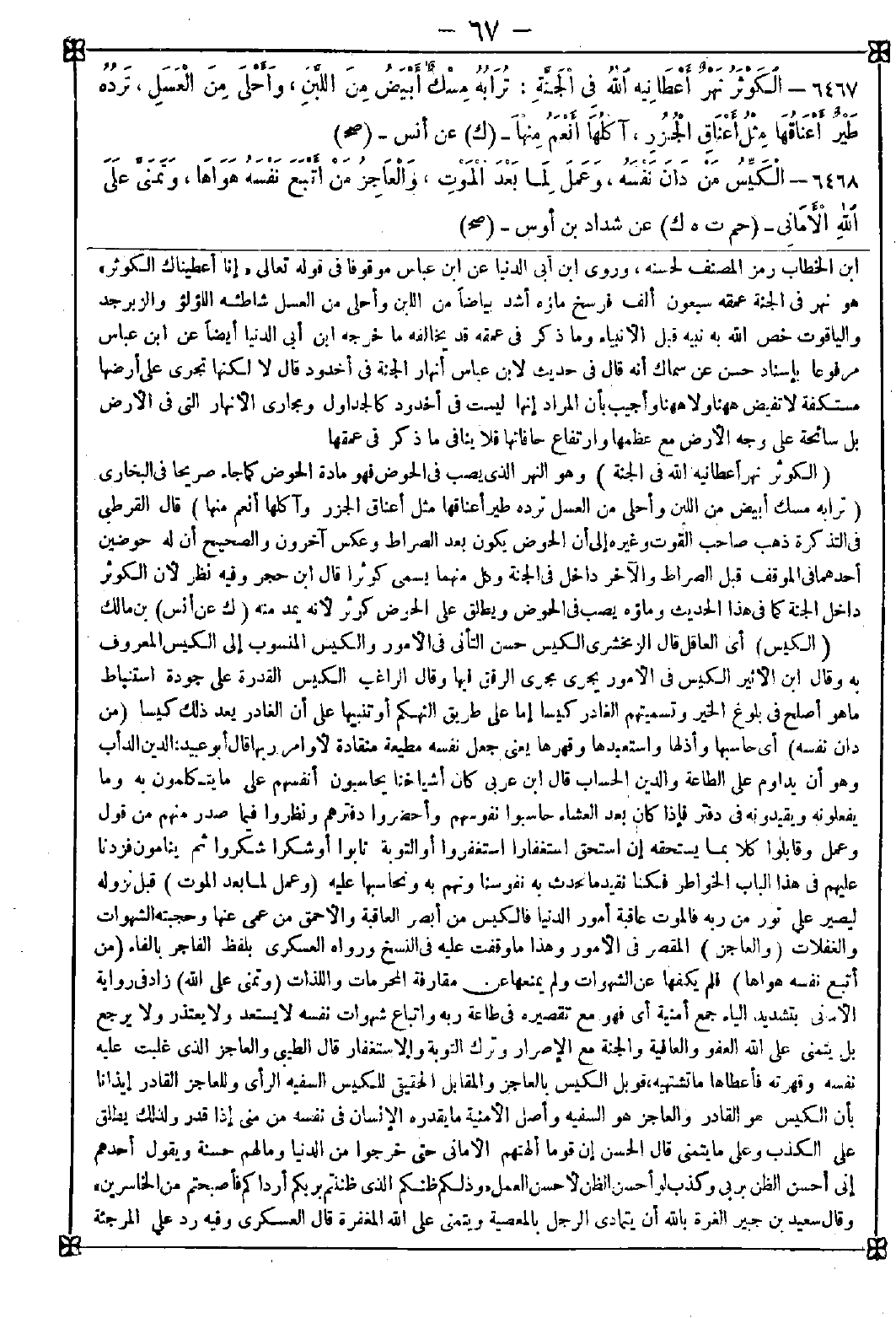 6467 - (الكوثر نهر أعطانيه الله في الجنة) وهو النهر الذي يصب في الحوض فهو مادة الحوض كما جاء صريحا في البخاري (ترابه مسك أبيض من اللبن وأحلى من العسل ترده طير أعناقها مثل أعناق الجزر وآكلها أنعم منها) قال القرطبي في التذكرة: ذهب صاحب القوت وغيره إلى أن الحوض يكون بعد الصراط وعكس آخرون والصحيح أن له حوضين أحدهما في الموقف قبل الصراط والآخر داخل في الجنة وكل منهما يسمى كوثرا قال ابن حجر: وفيه نظر لأن الكوثر داخل الجنة كما في هذا الحديث وماؤه يصب في الحوض ويطلق على الحوض كوثر لأنه يمد منه