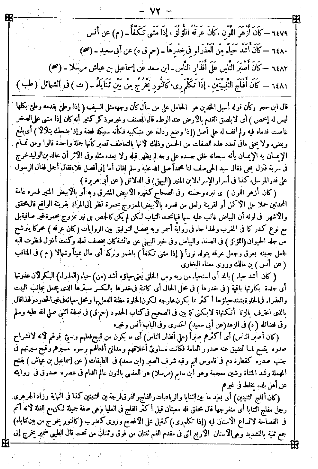 6479 - (كان أزهر اللون) أي نيره وحسنه وفي الصحاح كغيره الأبيض المشرق وبه أو بالأبيض المنير فسره عامة المحدثين حملا على الأكمل أو لقرينة ولعل من فسره بالأبيض الممزوج بحمرة نظر إلى المراد بقرينة الواقع قال محقق: والأشهر في لونه أن البياض غالب عليه سيما فيما تحت الثياب لكن لم يكن كالجص بل نير ممزوج بحمرة غير صافية بل مع نوع كدر كما في المغرب ولهذا جاء في رواية أسمر وبه يحصل التوفيق بين الروايات (كان عرقه) محركا يترشح من جلد الحيوان (اللؤلؤ) في الصفاء والبياض وفي خبر البيهقي عن عائشة كان يخصف نعله وكنت أغزل فنظرت إليه فجعل جبينه يعرق وجعل عرقه يتولد نورا (إذا مشى تكفأ) بالهمز وتركه أي مال يمينا وشمالا