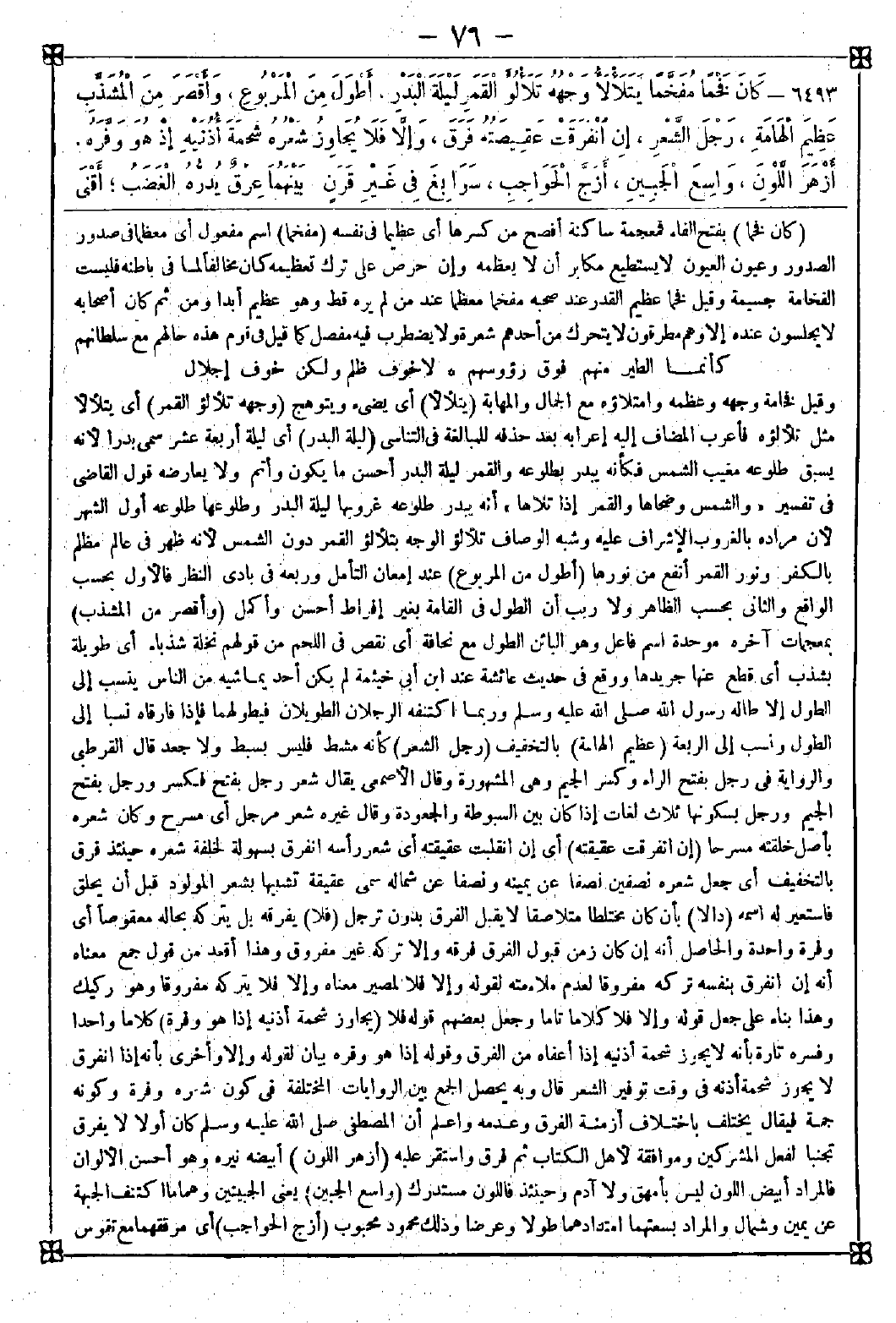 -[78]- الأمور النسبية المتفاوتة فحيث قيل بادن أريد عدم النحولة والهزال وحيث قيل ضرب أريد عدم السمن التام (سواء البطن والصدر) بالإضافة أو التنوين كناية عن كونه خميص البطن والحشاء أي ضامر البطن من قبل طويل النجاد أي القامة (عريض الصدر) في الشفاء واسع الصدر وفي المواهب رحب الصدر والعرض خلاف الطول قال البيهقي: كان بطنه غير مستفيض فهو مساو لصدره وظهره عريض فهو مساو لبطنه أو العريض بمعنى الوسيع أو مجاز عن احتمال الأمور (بعيد ما بين المنكبين) تثنية منكب مجتمع عظم العضد والمنكب وهو لفظ مشترك يطلق على ما ذكر وعلى المحل المرتفع من الأرض وعلى ريشة من أربع في جناح الطير (ضخم الكراديس) أي عظيم الألواح أو العظام أو رؤوس العظام وقال البغوي: الأعضاء وفيه دلالة على المقصود وقال محقق: والمراد عظام تليق بالعظم كالأطراف والجوارح وقد ثبت عظيم الأطراف والجوارح (أنور المتجرد) الرواية بفتح الراء قال البغوي وغيره: بمعنى نيره قال محقق: ولا حاجة له لأن أفعل التفضيل إذا أضيف فأحد معنييه الفضيل على غير المضاف إليه والإضافة للتوضيح فكأنه قال متجرده أنور من متجرد غيره قال البغوي وغيره: المتجرد ما جرد عنه الثياب وكشف من جسده أي كان مشرف البدن ثم المراد جميع البدن والقول بأن المراد ما يستر غالبا ويجرد أحيانا متعقب بالرد (موصول ما بين اللبة) بفتح اللام المنحر وهي التطامن الذي فوق الصدر وأسفل الحلق من الترقوتين (والسرة) بشعر متعلق بموصول (يجري) يمتد شبهه بجريان الماء وهو امتداده في سيلانه (كالخط) الطريقة المستطيلة في الشيء والخط الطريق وطلبه الاستقامة والاستواء فشبه بالاستواء وروي كالخيط والتشبيه بالخط أبلغ وهذا معنى دقيق المسربة المار (عاري الثديين والبطن مما سوى ذلك) أي ليس عليهما شعر سوى ذلك وما ذكر من أن اللفظ الثديين تثنية ثدي هو ما في نسخ هذا الجامع لكن في النهاية الثندوتين قال: وهما للرجل كالثديين للمرأة فمن ضم الثاء همز ومن فتحها لم يهمز أراد إن لم يكن على ذلك الموضع كثير لحم اه. والأول هو رواية الشفاء وغيره وقول القرطبي ولا شعر تحت إبطيه رده الولي العراقي بأنه لم يثبت والخصوصية لا تثبت بالاحتمال (أشعر) أي كثير شعر (الذراعين) تثنية ذراع ما بين مفصل الكف والمرفق وفي القاموس من طرف المرفق إلى طرف الأصبع الوسطى (والمنكبين وأعالي) جمع أعلى (الصدر) أي كان على هذه الثلاثة شعر غزير (طويل الزندين) بفتح الزاي عظما الذراعين تثنية زند كفلس وهو ما انحسر عنه اللحم من الذراع (رحب الراحة) واسعها حسا وعطاء ومن قصره على حقيقة التركيب أو جعله كناية عن الجود فحسب فغير مصيب. قال الزمخشري: ورحب الراحة أي الكف دليل الجود وصغرها دليل البخل قال محقق: وأما سعة القدمين فلم أقف عليه لكنه يفهم مما مر أنه ضخمها (سبط القصب) بالقاف أي ليس في ذراعيه وساقيه وفخذيه نتوء ولا تعقد والقصب جمع قصبة كل عظم أجوف فيه مخ (شثن الكفين) أي في أنامله غلظ بلا قصر وذلك يحمد في الرجل لكونه أشد لقبضه ويذم في النساء (والقدمين) وذا لا يعارضه خبر البخاري عن أنس ما مسست حريرا ولا ديباجا ألين من كفه لأن المراد اللين في الجلد والغلظ في العظام فيجتمع له نعومة البدن وقوته ومن ثم قال ابن بطال: كانت كفه ممتلئة لحما غير أنها مع ضخامتها لينة أو حيث وصف باللين واللطافة حيث لا يعمل بهما شيئا بل كان بالنسبة لأصل الخلقة وحيث وصف بالغلظ والشثونة فبالنسبة إلى امتهانهن بالعمل فإنه يتعاطى كثيرا من أموره (سائل الأطراف) بسين ولام أي ممتدها كذا في النهاية لكن البيهقي وغيره فسروه بممتد الأصابع طوال غير معقدة ولا متثنية ويؤيده رواية كأن أصابعه قضبان فضة أي أغصانها والوجه التعميم فقد ورد سبط القصب وفسر بكل عظم ذي مخ والسبوط الامتداد قاله أبو نعيم وروي شائل الأطراف بشين معجمة أي مرتفعها وهو قريب من سائل