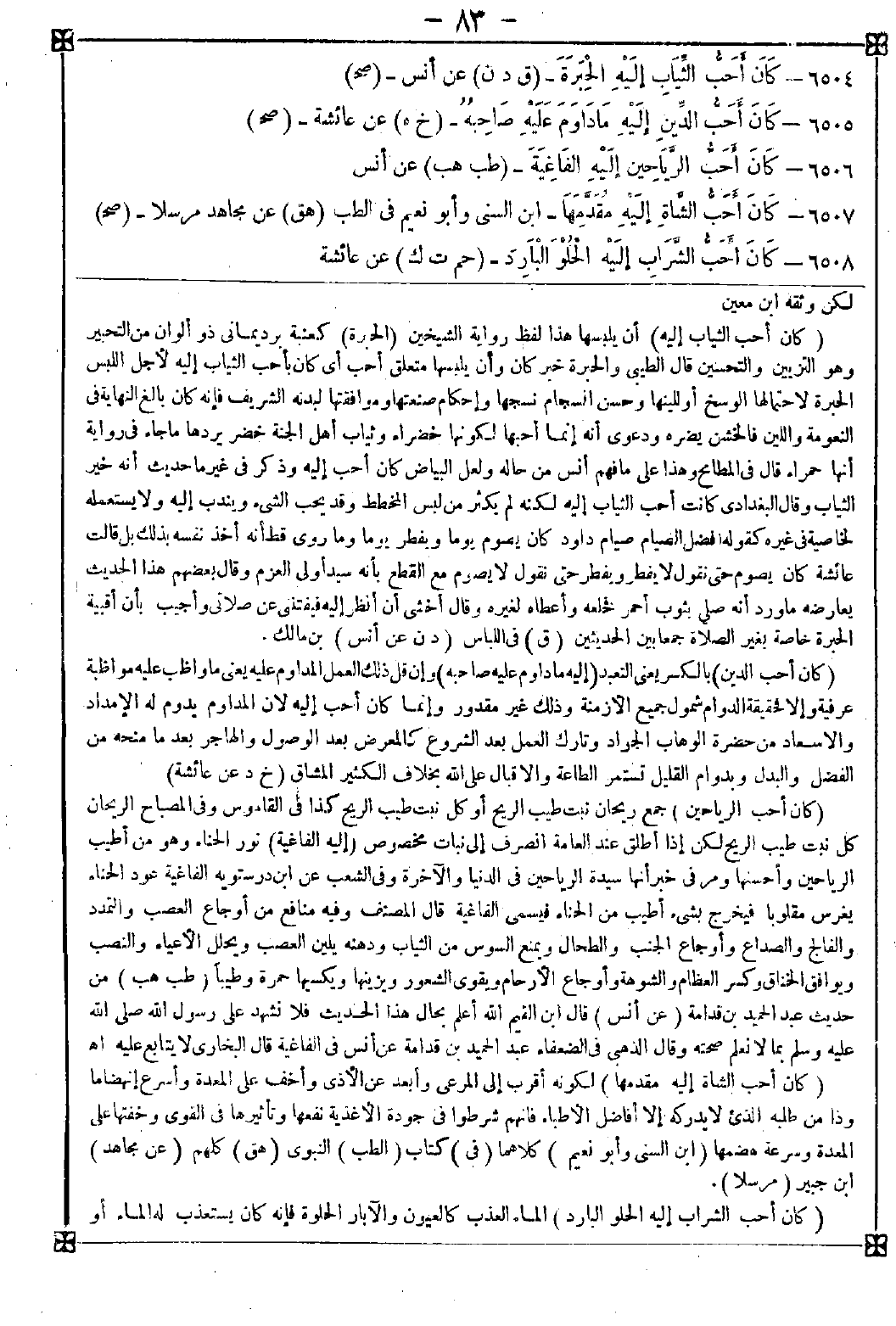 6504 - (كان أحب الثياب إليه) أن يلبسها هذا لفظ رواية الشيخين (الحبرة) كعنبة برد يماني ذو ألوان من التحبير وهو التزيين والتحسين قال الطيبي: والحبرة خبر كان وأن يلبسها متعلق أحب أي كان بأحب الثياب إليه لأجل اللبس الحبرة لاحتمالها الوسخ أو للينها وحسن انسجام نسجها وإحكام صنعتها وموافقتها لبدنه الشريف فإنه كان بالغ النهاية في النعومة واللين فالخشن يضره ودعوى أنه إنما أحبها لكونها خضراء وثياب أهل الجنة خضر يردها ما جاء في رواية أنها حمراء قال في المطامح: وهذا على ما فهم أنس من حاله ولعل البياض كان أحب إليه وذكر في غير ما حديث أنه خير الثياب وقال البغدادي: كانت أحب الثياب إليه لكنه لم يكثر من لبس المخطط وقد يحب الشيء ويندب إليه ولا يستعمله لخاصية في غيره كقوله أفضل الصيام صيام داود كان يصوم يوما ويفطر يوما وما روي قط أنه أخذ نفسه بذلك بل قالت عائشة: كان يصوم حتى نقول لا يفطر ويفطر حتى نقول لا يصوم مع القطع بأنه سيد أولي العزم وقال بعضهم: هذا الحديث يعارضه ما ورد أنه صلى بثوب أحمر فخلعه وأعطاه لغيره وقال: أخشى أن أنظر إليه فيفتنني عن صلاتي وأجيب بأن أقبية الحبرة خاصة بغير الصلاة جمعا بين الحديثين
