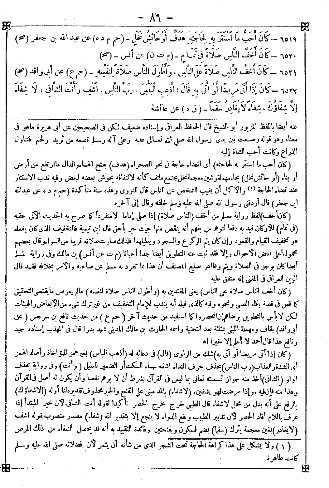 6522 - (كان إذا أتى مريضا أو أتي به) شك من الراوي (قال) في دعائه له (أذهب الباس) بغير همز للمؤاخاة وأصله الهمز أي الشدة والعذاب (رب الناس) بحذف حرف النداء اشفه بهاء السكت أو الضمير للعليل (وأنت) وفي رواية بحذف الواو (الشافي) أخذ منه جواز تسميته تعالى بما ليس في القرآن بشرط أن لا يوهم نقصا وأن يكون له أصل في القرآن وهذا منه فإن فيه {وإذا مرضت فهو يشفين} (لا شفاء) بالمد مبني على الفتح والخبر محذوف تقديره لنا أوله (إلا شفاؤك) بالرفع على أنه بدل من محل لا شفاء. قال الطيبي: خرج مخرج الحصر تأكيدا لقوله أنت الشافي لأن خبر المبتدأ إذا عرف باللام أفاد الحصر لأن تدبير الطبيب ونفع الدواء لا ينجع إلا بتقدير الله (شفاء) مصدر منصوب بقوله اشف (لا يغادر) بغين معجمة يترك (سقما) بضم فسكون وبفتحتين وفائدة التقييد به أنه قد يحصل الشفاء من ذلك المرض -[87]- فيخلفه مرض آخر وكان يدعو له بالشفاء المطلق لا بمطلق الشفاء وقال الطيبي: قوله شفاء إلى آخره تكميل لقوله اشف وتنكير سقما للتقليل واستشكل الدعاء بالشفاء مع ما في المرض من كفارة وأجور وأجيب بأن الدعاء عبادة وهو لا ينافيهما (1) قال ابن القيم: وفي هذه الرقية توسل إلى الله بكمال ربوبيته ورحمته وأنه وحده الشافي