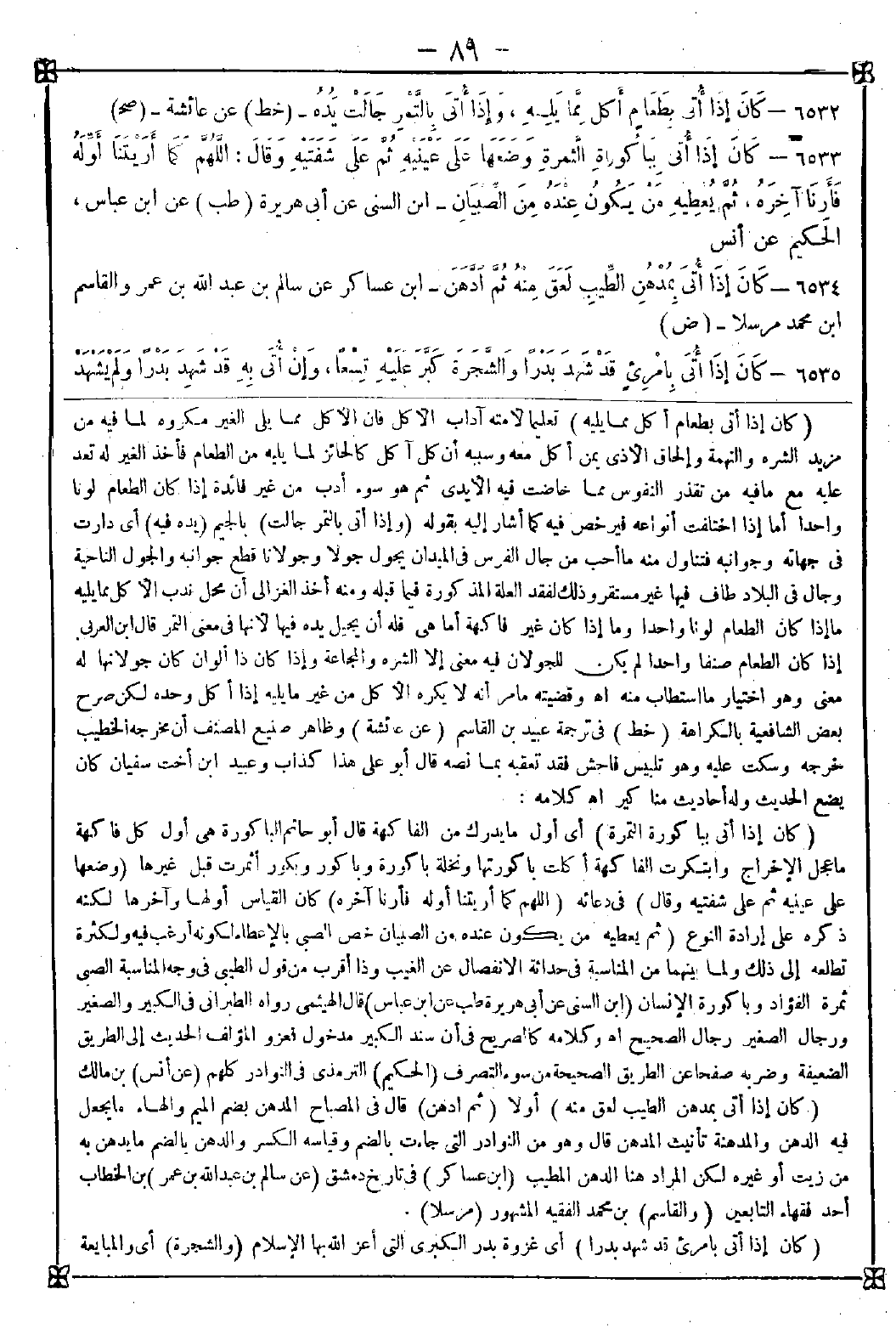 -[89]- 6532 - (كان إذا أتي بطعام أكل مما يليه) تعليما لأمته آداب الأكل فإن الأكل مما يلي الغير مكروه لما فيه من مزيد الشره والنهمة وإلحاق الأذى بمن أكل معه وسببه أن كل آكل كالحائز لما يليه من الطعام فأخذ الغير له تعد عليه مع ما فيه من تقذر النفوس مما خاضت فيه الأيدي ثم هو سوء أدب من غير فائدة إذا كان الطعام لونا واحدا أما إذا اختلفت أنواعه فيرخص فيه كما أشار إليه بقوله (وإذا أتي بالتمر جالت) بالجيم (يده فيه) أي دارت في جهاته وجوانبه فتناول منه ما أحب من جال الفرس في الميدان يجول جولا وجولانا قطع جوانبه والجول الناحية وجال في البلاد طاف فيها غير مستقر وذلك لفقد العلة المذكورة فيما قبله ومنه أخذ الغزالي أن محل ندب الأكل مما يليه ما إذا كان الطعام لونا واحدا وما إذا كان غير فاكهة أما هي فله أن يجيل يده فيها لأنها في معنى التمر قال ابن العربي: إذا كان الطعام صنفا واحدا لم يكن للجولان فيه معنى إلا الشره والمجاعة وإذا كان ذا ألوان كان جولانها له معنى وهو اختيار ما استطاب منه اه. وقضيته ما مر أنه لا يكره الأكل من غير ما يليه إذا أكل وحده لكن صرح بعض الشافعية بالكراهة