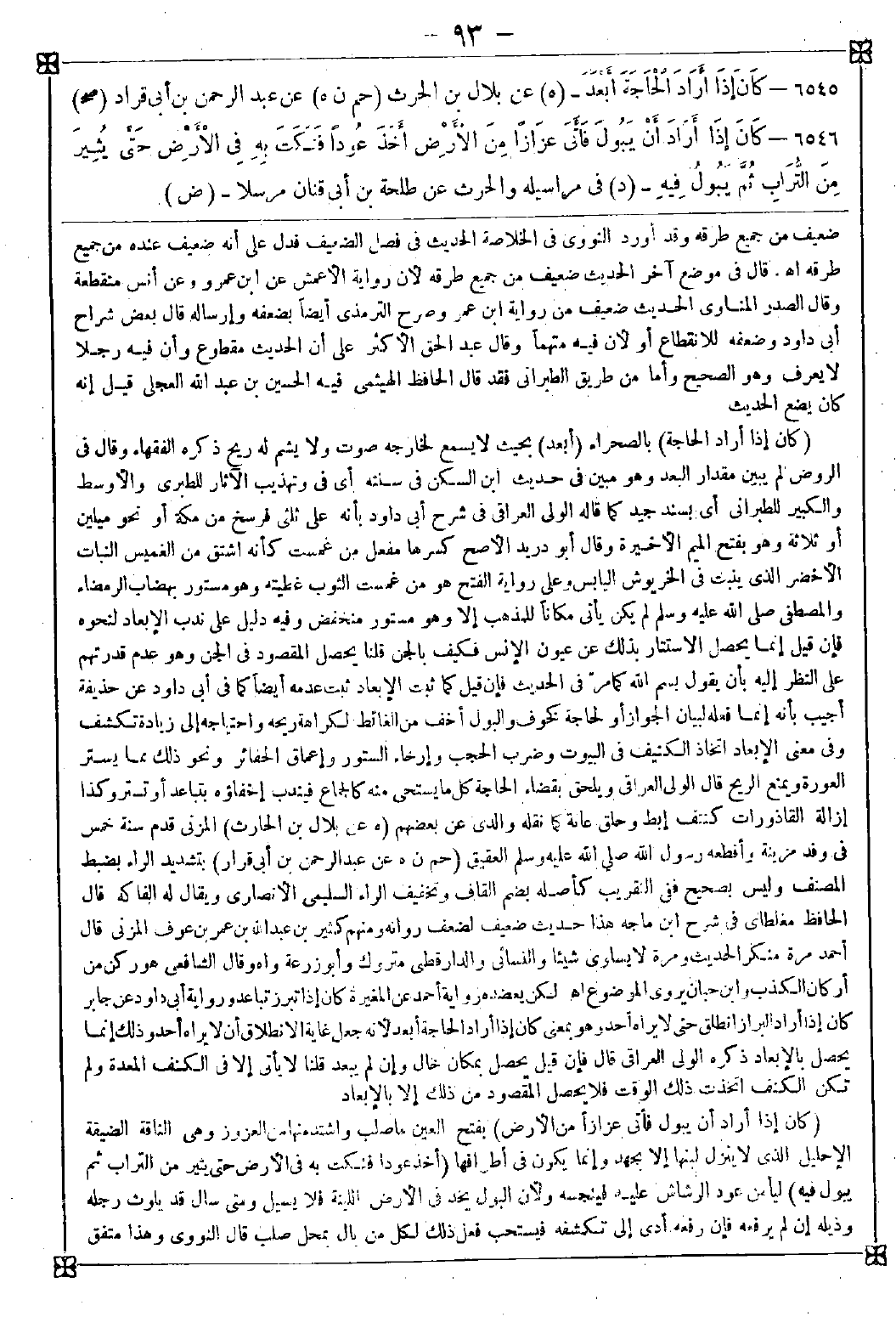 6546 - (كان إذا أراد أن يبول فأتى عزازا من الأرض) بفتح العين ما صلب واشتد منها من العزوز وهي الناقة الضيقة الإحليل الذي لا ينزل لبنها إلا بجهد وإنما يكون في أطرافها (أخذ عودا فنكت به في الأرض حتى يثير من التراب ثم يبول فيه) ليأمن عود الرشاش عليه فينجسه ولأن البول يخد في الأرض اللينة فلا يسيل ومتى سال قد يلوث رجله وذيله إن لم يرفعه فإن رفعه أدى إلى تكشفه فيستحب فعل ذلك لكل من بال بمحل صلب قال النووي: وهذا متفق -[94]- عليه