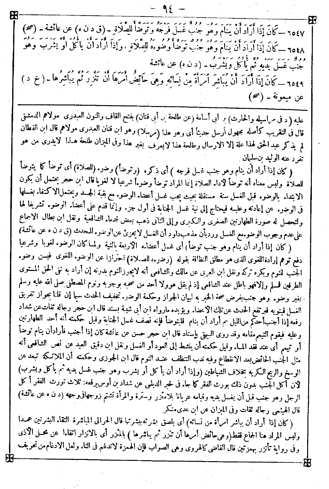 6547 - (كان إذا أراد أن ينام وهو جنب غسل فرجه) أي ذكره (وتوضأ) وضوء (للصلاة) أي توضأ كما يتوضأ للصلاة وليس معناه أنه توضأ لأداء الصلاة إنما المراد توضأ وضوءا شرعيا لا لغويا قال ابن حجر: يحتمل أن يكون الابتداء بالوضوء قبل الغسل سنة مستقلة بحيث يجب غسل أعضاء الوضوء مع بقية الجسد ويحتمل الاكتفاء بغسلها في الوضوء عن إعادته وعليه فيحتاج إلى نية غسل الجنابة في أول جزء وإنما قدم على أعضاء الوضوء تشريفا لها ولتحصل له صورة الطهارتين الصغرى والكبرى وإلى الثاني ذهب بعض قدماء الشافعية ونقل ابن بطال الإجماع على عدم وجوب الوضوء مع الغسل ورد بأن مذهب داود أن الغسل لا يجزئ عن الوضوء للمحدث