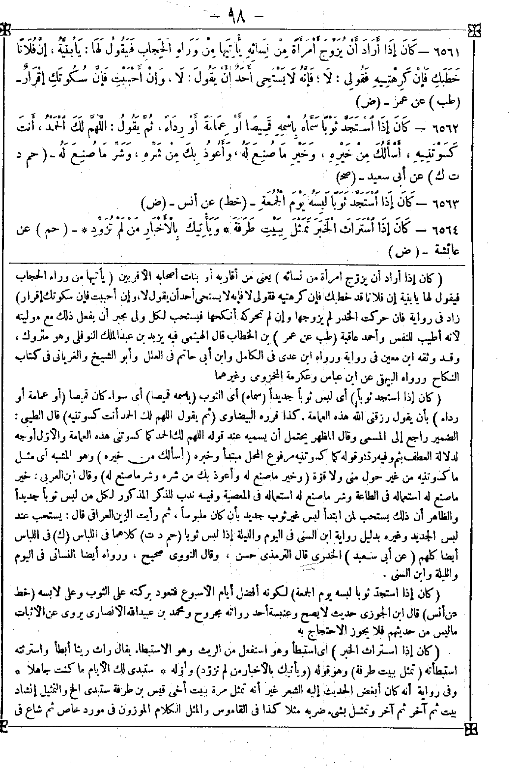 6562 - (كان إذا استجد ثوبا) أي لبس ثوبا جديدا (سماه) أي الثوب (باسمه قميصا) أي سواء كان قميصا (أو عمامة أو رداء) بأن يقول رزقني الله هذه العمامة. كذا قرره البيضاوي (ثم يقول اللهم لك الحمد أنت كسوتنيه) قال الطيبي: الضمير راجع إلى المسمى وقال المظهر: يحتمل أن يسميه عند قوله اللهم لك الحمد كما كسوتني هذه العمامة والأول أوجه لدلالة العطف بثم وفيه رد وقوله كما كسوتنيه مرفوع المحل مبتدأ وخبره (أسألك من خيره) وهو المشبه أي مثل ما كسوتنيه من غير حول مني ولا قوة (وخير ما صنع له وأعوذ بك من شره وشر ما صنع له) وقال ابن العربي: خير ما صنع له استعماله في الطاعة وشر ما صنع له استعماله في المعصية وفيه ندب للذكر المذكور لكل من لبس ثوبا جديدا والظاهر أن ذلك يستحب لمن ابتدأ لبس غير ثوب جديد بأن كان ملبوسا ثم رأيت الزين العراقي قال: يستحب عند لبس الجديد وغيره بدليل رواية ابن السني في اليوم والليلة إذا لبس ثوبا